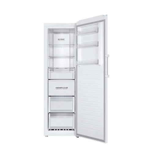 Haier H3F-320WSAAU1 vrieskast. Met deze vrieskast haal je een ruime en energiezuinige diepvriezer in huis. De vriezer beschikt over 285 liter bruikbare ruimte. Je kunt hier dus heel wat maaltijden en ijsjes in kwijt. Tijdens het ontwerpen van de vriezer is er ook aan het milieu gedacht. De Haier H3F-320WSAAU1 beschikt over energielabel A+++ en dat is goed voor het milieu én voor je portemonnee. De meeste vriezers moet je regelmatig ontdooien om de temperatuur optimaal te laten zijn. En je kunt de vriezer via een app aansluiten zodat je op de hoogte wordt gesteld van plotselinge stijgingen van temperatuur of stroomuitval. Bedienen via de LED display aan de buitenzijde.De vrieskast is voorzien met Supervriezen functie. Dit is een erg praktische functie die je de temperatuur niet te snel laten dalen van de in de koelvriescombinatie aanwezige producten door vers gekochte artikelen. En de Freshness zone Tray – dit een lade waarin je voedsel kun bewaren met een temparatuur tot -26°C! Zodat ze langer vers blijven. Ook is het mogelijk om in deze tray (koelmodus) goederen te bewaren met een temparatuur tot 4°C.De deur is gemakkelijk en eenvoudig te open doormiddel van een vacuümklink en 90°C deuropening. Bovendien voorkomt het ook dat er te veel kou ontsnapt en dat jouw diepvriesproducten beschadigd raken. Kortom, een praktische en innovatieve deurklink, met een eenvoudige bediening in een hoogwaardig designOntdooien is dankzij de No-Frost technologie bij de Haier H3F-320WSAAU1 niet nodig. Deze technologie zorgt ervoor dat er geen ijslagen aan de wanden ontstaan en dat de temperatuur altijd in orde is. Omdat het ijs aan de wanden best wat ruimte in beslag kan nemen, kun je dankzij de No-Frost technologie ook optimaal gebruik maken van de ruimte die er is. Een digitale display zorgt ervoor dat de temperatuur goed te lezen is. Daarnaast wordt de temperatuur digitaal geregeld, waardoor hij altijd in orde is.De draairichting van de deur(en) is te wijzigen naar eigen inzicht. Het is niet eenvoudig dit zelf te doen. Je kunt de servicedienst van Haier (of een door Haier goedgekeurde servicedienst) in je regio benaderen om dit tegen een geringe vergoeding voor je te regelen. Mocht je toch besluiten om dit klusje zelf te klaren, valt de eventuele schade die wordt veroorzaakt bij pogingen om de deuropening om te draaien niet onder de garantie van Haier. Wehkamp kan deze service helaas niet aanbieden.