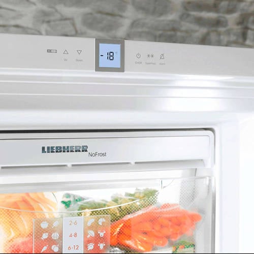 Liebherr GNP 2356-23 Premium vrieskast met energieklasse A++ en een vriesruimte van 185 liter. De GNP 2356-23 Premium heeft onder andere een akoestisch deuralarm en een optisch en akoestisch temperatuuralarm, kinderbeveiliging, een digitaal temperatuurdisplay en 6 met LED verlichte vriesladen. Ook heb je de beschikking over een separate vruchten- en kruidenlade.Tevens beschikt de vriezer over NoFrost, VarioSpace en een SuperFrost automaat. FrostSafe zorgt ervoor dat iedere vrieslade gebruikt kan worden om etenswaren in te vriezen, doordat rondom elke vrieslade kou wordt geproduceerd. Ook krijg je 2 koude accu’s meegeleverd. Met deze koude accu’s kun je bij een eventuele stroomstoring de bewaartijd verlengen. De koude accu bieden dan extra koeling waardoor de ingevroren producten extra beveiligd zijn tegen temperatuurstijging. Je kunt ze natuurlijk ook gebruiken om je diepvriesproducten in je koeltas bij het boodschappen doen extra koel te houden. NoFrostBij een gewone vrieskast wordt de warmte onttrokken aan de vriesruimte, maar niet het vocht dat zich in die lucht bevindt. In het vriesgedeelte ontstaat daardoor rijpvorming, ofwel ijsafzetting.Bij NoFrost wordt de lucht met vocht en al uit het vriesdeel gezogen. De lucht wordt gekoeld en het vocht wordt als ijs vastgehouden door de verdamper. Deze wordt regelmatig volautomatisch ontdooid waarbij het vocht wordt afgevoerd naar een bakje op de motor waar het verdampt. Een ventilator blaast de koude en droge lucht weer terug in de kast.VariospaceVarioSpace staat voor variabel te gebruiken ruimte. Het biedt de mogelijkheid de vriesruimte aan te passen aan het formaat van de in te vriezen producten. Dankzij de vervanging van vaste verdamperplaten door glasplateaus, is het mogelijk de glasplateaus en laden uit te nemen waardoor één grote vriesruimte ontstaat. Uitnemen van een glasplateau en een lade biedt daardoor ruimte aan extra hoge producten.FrostSafeMet het FrostSafe systeem van Liebherr wordt er rondom elke vrieslade koude geproduceerd. Hierdoor kun je iedere lade zowel voor invriezen als voor het bewaren van uw producten gebruiken. Het lastige overpakken van bevroren producten behoort hiermee tot het verleden. De rondom gesloten, transparante vriesladen functioneren ieder op zich als een koude safe en bieden een goed overzicht over al je producten.SuperFrostSuperFrost verlaagt de temperatuur automatisch tijdelijk naar -32°C waarmee een koudereserve voor vitaminevriendelijk invriezen wordt gecreëerd. Te langzaam invriezen zorgt ervoor dat de cellen beschadigd raken wat bij het ontdooien van het product leidt tot vochtverlies. Wanneer bijvoorbeeld vlees te langzaam is ingevroren zal bij het ontdooien veel vocht weglopen wat de dichtheid en smaak van het product nadelig beïnvloedt. Bij het inschakelen van SuperFrost wordt de temperatuur snel verlaagd naar -32°C. Wanneer warmere, pas gekochte levensmiddelen in de vriezer worden gelegd zal de temperatuur in de vriezer wel stijgen maar deze zal niet boven de -18°C uitkomen. Hierdoor zullen enerzijds de reeds ingevroren levensmiddelen diepgevroren blijven en anderzijds zullen de verse producten sneller worden ingevroren waarmee de celstructuur van de producten niet wordt aangetast en smaak, vitaminen en structuur behouden blijven.Wijziging draairichting deurDe draairichting van de deur(en) is te wijzigen naar eigen inzicht. Het is mogelijk dit zelf te doen of onze bezorger zet hem tegen een geringe vergoeding voor je om. Je kunt dit aangeven onder het kopje service.
