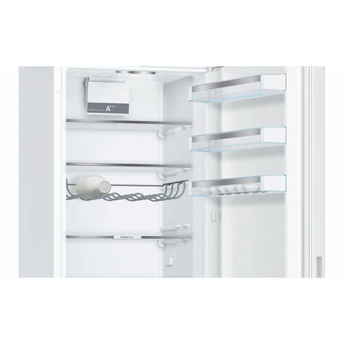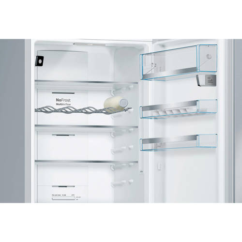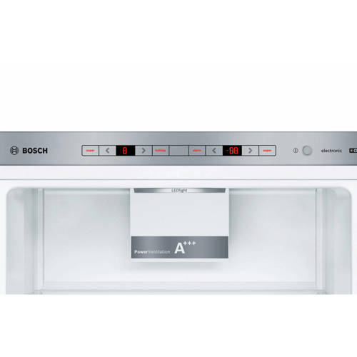 Bosch KGN36NW30 koelvriescombinatie met energieklasse A++, een koelruimte van 215 liter en een vriesruimte van 87 liter. De KGN36NW30 heeft onder andere een elektronische temperatuurregeling, die regelt de gewenste temperatuur makkelijk en duidelijk, controle door LED-indicatie. Tevens beschikt de koelvriescombinatie over LED verlichting, deze verlicht de koelkast gelijkmatig zonder te verblinden, hoeft nooit vervangen te worden want de verlichting gaat net zo lang mee als de koelkast zelf. Ook beschikt de KGN36NW30 over NoFrost dit betekent nooit meer ontdooien dankzij de perfecte bescherming tegen rijp- en ijsvorming, scheelt tijd en moeite! Je vindt in het koelgedeelte 4 plateaus van veiligheidsglas, waarvan 3 in hoogte verstelbaar en de derde vindt je op de Multibox. Een transparante lade met gegolfde bodem, perfect voor het bewaren van fruit en groente. Van de 3 laden in het vriesgedeelte is er een open en 2 transparant voorzijde zodat je in een opslag kunt zien, wat waar ligt. Ook is de KGN36NW30 voorzien van Supervriezen - dwz vriest pas ingeladen voedsel sneller in en biedt zo bescherming voor reeds ingevroren voedingsmiddelen.Elektronische temperatuurregelingDe elektronische besturing houdt de ingestelde temperatuur precies constant. De ingestelde temperatuur is gemakkelijk via de gekleurde LED's af te lezen. Bovendien kun je via de geïntegreerde toetsen zowel de temperatuurinstelling wijzigen als het super-koelen inschakelen.NoFrostDe vorming van ijs wordt aanzienlijk verminderd, daarom hoeft er veel minder vaak ontdooit te worden, scheelt werk en bespaart energie.Wijziging draairichting deurDe draairichting van de deur(en) is te wijzigen naar eigen inzicht. Het is mogelijk dit zelf te doen of onze bezorger zet hem tegen een geringe vergoeding voor je om. Je kunt dit aangeven onder het kopje service.