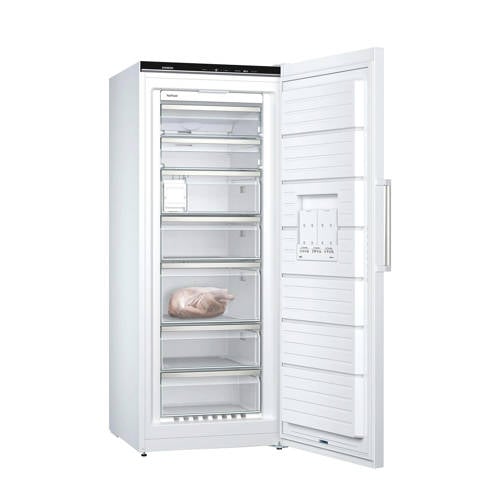 Deze vriezer heeft een inhoud van 327 en heeft een breedte van 70 cm. Een geschikte vrieskast voor iedere gezinskeuken. Het NoFrost systeem zorgt ervoor dat je de vriezer niet handmatig hoeft te ontdooien. De elektronische temperatuurregeling geeft je complete controle over de optimale temperatuur. Hierdoor hoeft de vriezer niet extreem hard te werken om weer op de gewenste temperatuur te komen, wat goed is voor de energiezuinigheid en de ingevroren producten. Verder is de vriezer voorzien van een IceTwister en geeft de vriezer een signaal wanner de deur te lang open staat.Etenswaren langer versDe slimme sensoren houden de temperatuur in de vriezer constant. Hierdoor hoeft de vriezer niet extreem hard te werken om weer op de gewenste temperatuur te komen, wat goed is voor de energiezuinigheid en de ingevroren producten. Het multiAirflow-systeem verdeelt de gekoelde lucht en zorgt voor een gelijkmatige temperatuur in de gehele vriesruimte, ook als deur iets langer open heeft gestaan. De constante temperatuur houdt etenswaren langer vers en maakt dat warme levensmiddelen sneller afkoelen. Bovendien is deze Siemens vriezer met A+++ zeer energiezuinig.Gemak met noFrostBij een vriezer met het noFrost-luchtcirculatiesysteem wordt vochtige lucht uit de binnenruimte geleid waardoor rijp- en ijsvorming voorkomen wordt. Er ontstaat dus geen ijslaag aan de binnenkant van de vriezer, waardoor je de vriezer nooit meer hoeft te ontdooien.