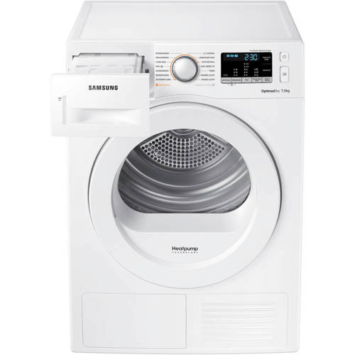 De nieuwe DV70M5020KW/EN warmtepompdroger van Samsung is zacht voor kleding en energiezuinig door de optimal dry functie. Drogers met een mooi design bijpassend bij de Samsung wasmachines. En voorzien van energieklasse A++, elektronische besturing en een belading van 7 kg. Met programma’s voor elke textielsoort en nog meer keuzes blijft Samsung uitblinken in innovatieve technologieën. De nieuwe Diamond Drum warmtepompdroger zorgt ervoor dat je niet hoeft te raden naar het juiste programma voor je kleding. Dit garandeert dat ál je kleding er langer als nieuw uit blijft uitzien. De DV70F5E0HGW heeft onder andere resttijdindicatie op het LED display, kinderslot en geeft een eindsignaal. Tevens beschikt de warmtepompdroger over Diamond Drum-technologie. Verder geeft een waterniveauindicator aan hoeveel water er in het reservoir zit. Zodoende hoef je het reservoir niet te openen om het waterniveau te controleren. Ook kun je de gemakkelijk de vuldeur andersom monteren. Na installatie bepaal je gewoon zelf welke kant voor je het makkelijkst is om de deur te openen.2-in-1 Filter: Eén filter, optimale filtereigenschappen en minimaal onderhoudHet 2-in-1-filter heeft twee roosters, zodat de warmtewisselaar geen filter nodig heeft en je altijd perfect droge was hebt. De machine geeft aan wanneer het filter en de warmtewisselaar schoongemaakt moeten worden. Het is een handig geheugensteuntje omdat dit snel vergeten kan worden.Optimal Dry: Intelligente sensoren zorgen voor energiezuinig drogenOptimalDry is een intelligent droogsysteem met sensoren die de vochtigheid en temperatuur registreren en aangeven wanneer de warmtewisselaar gereinigd moet worden. Het past de droogtijd voortdurend aan voor het beste resultaat, maximale bescherming en een minimaal energieverbruik. Diamond Drum-technologieSamsung maakt in de DV70M5020KW/EN warmtepompdroger gebruik van de Diamond Drum-technologie, waarbij de standaardtrommel is vervangen door een trommel met een diamantvormig reliëfprofiel met verzonken gaatjes. Deze revolutionaire structuur voorkomt dat het wasgoed blijft haken en zorgt er tegelijk voor dat de was op een veilige manier toch goed schoon wordt. Zorg dat jouw kleding als nieuw blijft en vertrouw deze toe aan de exclusieve Diamond Drum-trommel Samsung.Antikreuk-functieDeze functie laat de droger nog even zonder warmte doordraaien om kreukels te helpen voorkomen.Kindveilige vergrendeling van de bedieningsknoppenDe vergrendeling van de knoppen zorgt ervoor dat nieuwsgierige handjes de instellingen op het bedieningspaneel niet kunnen veranderen, zodat kinderen de wascyclus niet per ongeluk verstoren. Als het systeem is ingeschakeld, verschijnt er een indicator op het paneel.