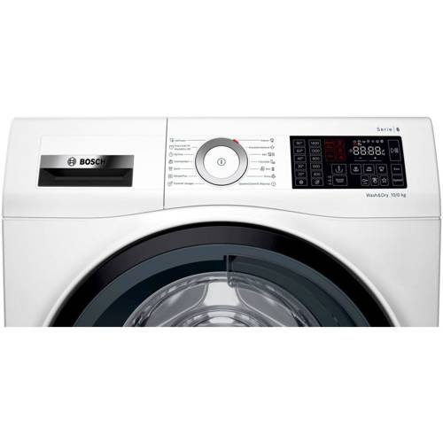 De Bosch WDU28540NL wasdroogcombinatie bespaart water bij het drogen en frist jouw wasgoed op. Voorzien met Autodry voor perfecte was en droogresultaten voor al je wasgoed. Je wast en droogt in één beurt maximaal 6 kg wasgoed schoon zonder dat je wasgoed van de wasmachine naar de droger hoeft te verplaatsen. Dat scheelt weer tijd en daarmee is hij ideaal wanneer je geen ruimte hebt voor een wasmachine en wasdroger apart. Wil je alleen wassen? Dat kan tot maximaal 10 kg. Bovendien beschikt de wasmachine over 12 verschillende wasprogramma’s en wel 2 elektronische droogprogramma's, tijdgestuurd en droogprogramma. Kies naast uit de standaardprogramma’s uit speciale was programma's zoals Allergie+, Dons, Trommel reiniging met geheugenfunctie, Extra snel 15', Overhemden, Mix, MyTime, en Sport.Verder heb je de beschikking over extra functies in wassen zoals: Extra spoelen, Licht strijken, EcoPerfect, Hygiëne+, Kinderslot, Favorieten, Extra stil wassen, SpeedPerfect, Voorwas en Extra water. Met het wasprogramma Hygiëne was je jouw wasgoed met hete lucht voor een hygiënische verzorging. Handig als je bijvoorbeeld alleen maar nare luchtjes wilt verwijderen uit kleding. Ook heb je speciale droogprogramma en extra droogfuncties zoals o.a. Opfrissen, MyTime, Wash&Dry 60 min, Strijkdroog, EcoPerfect, Nachtprogramma/Stil programma, Drogen, Snel, Kastdroog, en Kastdroog+. En op het MultiTouch LED-display lees je het programma verloop, de temperatuur, de centrifugesnelheid, de resttijd en de 24 u eindtijd uitstel af. Met bijvulfunctie - ben je iets vergeten toe te voegen? Pauzeer dan je wasprogramma en voeg het vergeten stuk wasgoed nog even snel toe. Verder is er aan veiligheid gedacht, met AquaStop waterbeveiliging: de meest betrouwbare waterbeveiliging met levenslange garantie en kinderbeveiliging op de deur. Wasdroogcombinatie met zelfreinigende condensorDe Bosch WDU28540NL heeft een zelfreinigende condensor. Bij het drogen van was vervuilen micropluisjes de binnenzijde van de machine. Op langere termijn wordt er dan veel meer energie verbruikt. De zelfreinigende condensor reinigt zichzelf vier keer per droogbeurt met condenswater, waardoor micropluisjes geen kans krijgen om zich te nestelen. Daardoor blijven optimale prestaties en een laag energieverbruik gegarandeerd.Zuinige wasdroogcombinatieDe Bosch WDU28540NL beschikt over een koolborstelloze motor. Dit zorgt ervoor dat je relatief zunig wast en droogt, maar ook dat de wasdroogcombinatie stil is. De motor heeft namelijk geen koolborstels nodig die voor de aandrijving van de wasdroogcombinatie zorgen. Op deze EcoSilence Drive motor heb je vanuit Bosch 10 jaar garantie.Energie- Energieverbruik per jaar alleen wassen, 244 kWh (per jaar – 200 maximale beladingen)- Energieverbuik per jaar (wassen en drogen) 1088 kWh (per jaar – 200 maximale beladingen)- Energie-efficiëntieklasse A- Energieverbruik (alleen wassen) (kWh) 1,22 kWh- Energieverbuik (wassen en drogen volle belading) (kWh) 6,82 kWh- Wasprestatieklasse A- Waterverbruik per jaar (wassen) 13.800(200 maximale beladingen)- Waterverbuik per jaar (wassen en drogen) 25000(200 maximale beladingen)- InhoudRVStrommel 70 liter- Geluidsniveau drogen 61 dB- Geluidsniveau centrifugeren 71 dB- Geluidsniveau wassen 47 dB