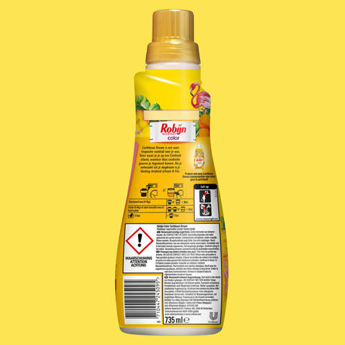 Bevat een zomerse tropische geurWanneer je je kleren met dit Robijn Klein & Krachtig Caribbean Dream Color vloeibaar wasmiddel was, waan je even op een Caribisch eiland. Het wasmiddel zorgt ervoor dat je kleding niet alleen schoon wordt, maar biedt ook bescherming aan de vezels waardoor je kleding langer meegaat. Robijn Caribbean Dream behoort daarnaast tot de Klein & Krachtig lijn van Robijn. Dit zijn extra geconcentreerde verpakkingen, die net zo lang meegaan als de grotere verpakkingen én dus beter zijn voor het milieu.Kenmerken:- Bevat een tropische geur- Verrijkt met CareSerum- Beschermt je kleding tegen slijtage- Langdurige frisheid- De acht 735 ml verpakkingen zijn samen goed voor 168 wasbeurtenGebruiksaanwijzing:- Voor alle bonte en gekleurde was op 15-30-40-60°C- Lees het wasetiket in de kleding- Licht- en donkergekleurd wasgoed niet samen wassen- Nieuwe gekleurde kleding eerst apart wassen of controleren op kleurafgifte- Giet de aanbevolen dosering in de waslade of in de doseerbal en doe deze in de trommel- Robijn Klein & Krachtig Color wasmiddel kan gebruikt worden voor alle textielsoort, behalve wol en zijde, gebruik daarvoor Robijn Wol & Fijn