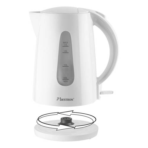 Deze Bestron AWK1700W waterkoker heeft een vermogen van 2200 Watt en een inhoud van 1,7 liter. Met de AWK1700W kook je snel water voor bij voorbeeld thee of soep. Deze snoerloze waterkoker is voorzien van een waterniveauaanduiding, een scharnierend deksel met veiligheidssluiting, automatische kookstop, droogkookbeveiliging en een praktisch snoeropwikkelsysteem. Het geïntegreerde rvs warmte-element is ongevoelig voor kalkaanslag.Specificaties- Vermogen: 2200 Watt- Inhoud: 1,7 liter- Automatische afslag- Fijnmazig uitneembaar kalkfilter- Droogkookbeveiliging- Geïntegreerd verwarmingselement- 360 graden draaibaar- Snoerloos- Snoeroprolsysteem- Aan/uit schakelaar met controlelampje- Anti-slip voetjes- Waterniveau aanduiding- Behuizing van hoogwaardig kunststof- Kleur: wit- Garantietermijn: 2 jaarAfmetingen en gewicht- Afmetingen (hxbxd): 24,5x15x22 cm- Gewicht: 0,82 kg