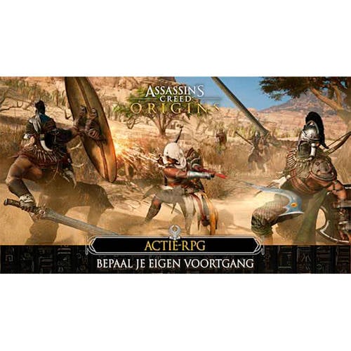 Reis af naar het oude Egypte, het meest mysterieuze tijdperk uit de geschiedenis tijdens een cruciale periode die de wereld heeft veranderd. Ontdek de geheimen van de grote pyramides, vergeten mythes, de laatste farao’s en – beschreven in verloren hiërogliefen – het ontstaan van het broederschap van de Assassins.De afgelopen vier jaar heeft het team achter het veelgeprezen Assassin’s Creed IV Black Flag zich gewijd aan het creëren van een nieuw begin voor de serie. Vecht op een geheel nieuwe manier waarbij je naadloos wisselt tussen je unieke wapens en meerdere vijanden tegelijkertijd uitschakelt. Ontwikkel je eigen Assassin-vaardigheden terwijl je het volledige oude Egypte verkent, meerdere missies aanneemt en boeiende verhalen beleeft tijdens jouw reis, welke de beschaving zal veranderen.Kenmerken:ONTDEK DE MYSTERIES VAN HET OUDE EGYPTE – Ontdek oude tombes, verken de grote pyramides en ontrafel de geheimen van mummies, de goden en de laatste farao’s.EEN NIEUW BEGIN – Start hier, aan het begin. Dit is het onvertelde verhaal over het ontstaan van de Assassins. Jij bent Bayek, beschermer van Egypte, wiens persoonlijke verhaal zal leiden naar het ontstaan van het broederschap van de Assassins.OMARM ACTIE-RPG – Vecht op nieuwe manieren met verschillende wapens met hun eigen statistieken en zeldzaamheid, terwijl je buit verzamelt. Geniet van een diep RPG-voortgangssysteem, kies jouw voorkeursvaardigheden en test je kracht tegen unieke, sterke bazen.ELKE MISSIE IS EEN MEESLEPEND AVONTUUR – Kies en voltooi missies op jouw tempo. Elke missie vertelt een intens en emotioneel verhaal vol met kleurrijke personages en betekenisvolle doelen.VERKEN EEN VOLLEDIG LAND – Van woestijnen tot weelderige oases. Van de Middellandse Zee tot de tombes van Giza. Neem het op tegen gevaarlijke facties en wilde beesten tijdens jouw reis door dit enorme, onvoorspelbare land.