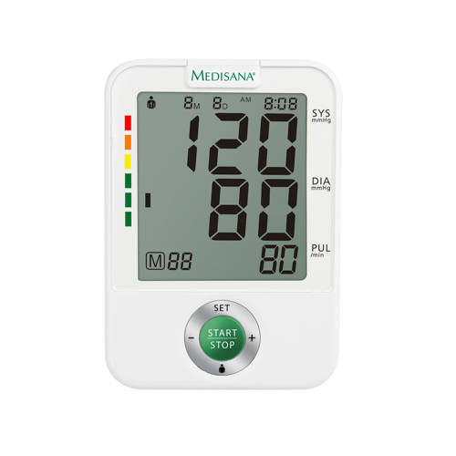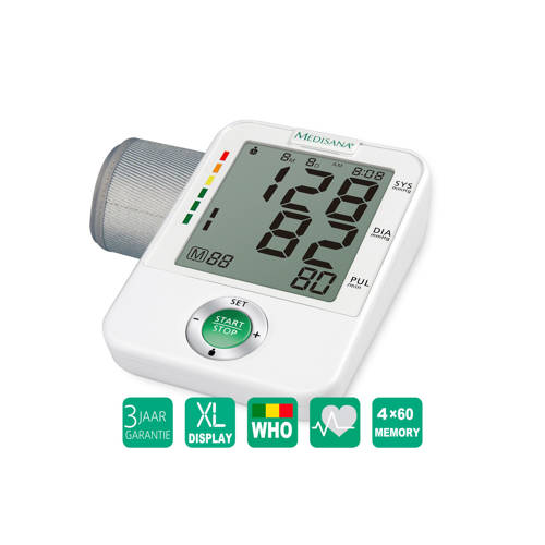 Veel welvaartsziekten kunnen worden voorkomen door regelmatige controle van de bloeddruk. De juiste bloeddruk is immers erg belangrijk voor alle vitale organen als hart en longen, maar ook lever, nieren en hersenen.Met dezeMedisana BUA50bovenarmbloeddrukmeter meet u zeer betrouwbaar en nauwkeurig uw bloeddruk. Bevestig de manchet om uw bovenarm en start de meting met één druk op de knop. Na deze eenvoudige stap hebt u direct zicht op uw vitale gegevens en ziet u in een duidelijk overzicht uw bovendruk, onderdruk en hartslag op het extra grote display.Voor de beoordeling van die gegevens hoeft men geen volleerd arts te zijn: dankzij de kleurenschaal-indeling volgens de richtlijnen van de World Health Organisation (WHO) weet u precies in welke staat uw bloeddruk zich bevindt, van groen (goed) tot rood (te hoog). Ook herkent de BU A50 bloeddrukmeter een onregelmatige hartslag (aritmie) zodat u tijdig weet wanneer u uw arts dient te raadplegen. U kunt voor maar liefst 4 gebruikers tot 60 metingen per persoon opslaan. Ieder voorzien van de tijd en datum, waardoor u ook voor langere periode de gevolgen van uw levensstijl kunt volgen. Zo krijgt u grip op uw bloeddruk en zult u altijd het overzicht behouden.