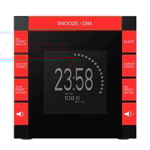 De Dcybel London wekkerradio is uitgerust met een helder LED-beeld met daarbij een plafondprojectie zodat je meteen ziet hoe laat het is.Wakker worden met het wekkergeluid of uw favoriete radiozender dankzij de geïntegreerde FM-tuner (10 bekende zenders). Bovendien stel je met het dubbele alarm jouw wektijd en die van jouw partner onafhankelijk van elkaar in.Voor degene die rustig wakker willen worden zit er uiteraard ook een Snooze-functie op.Wil je in slaap vallen met je favoriete muziek op de achtergrond? Op de wekker kun je instellen wanneer de muziek moet stoppen. Zo val je lekker in slaap zonder je druk te maken dat de muziek de hele nacht verder speelt.In geval van een stroomstoring nemen de batterijen (niet inbegrepen) het over, zodat je nooit te laat bent!