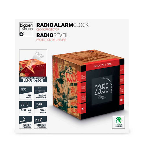 Deze Bigben radio klok met een stoere Rockwood design staat geweldig op elke slaapkamer. De projectie is aanpasbaar en je hebt de keus om wakker te worden met de 'buzzer' functie of met je favoriete radiozender. Het LCD scherm is te dimmen en de wekker kan zowel via het netstroom als met batterijen gebruikt worden.