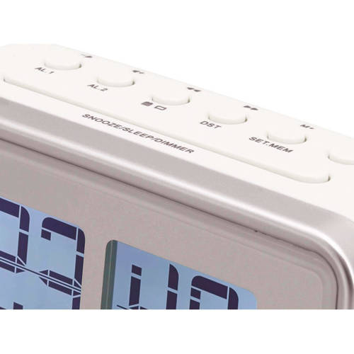 cDeze retro Soundmaster UR105WE, kleur wit, heeft niet lleen digitale maar ook ingebouwde FM radio. De wekker heeft dubbelalarm, wektoon met radio of buzzer. De FM radio beschikt over voorkeurzenders zodat u met een druk op de knop altijd op uw favoriete radiozender afstemt. Bovendien is de LCD display dimbaar.Kenmerken:- FM radio- Voorkeuze zenders- Weksignaal door radio of zoemer- Dubbel alarmSlaap/ Snooze functie- Dimbaar LCD displayNetvoeding AC 230V~50Hz-Batterij 1x CR2032 (niet meegeleverd)