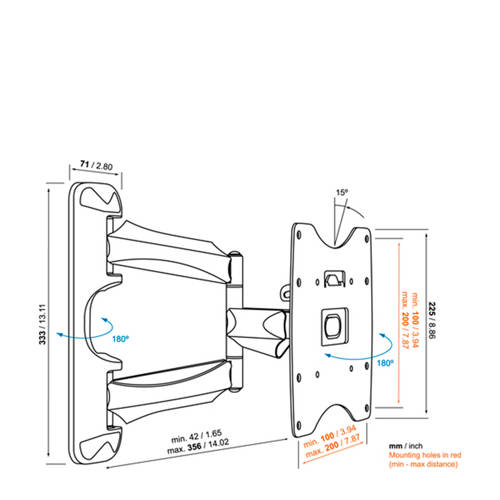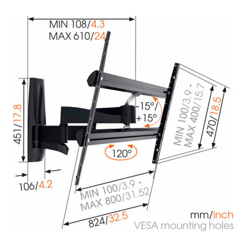 De Vogel's Base 45 Sturnmuurbeugel is tot 180 graden draaibaar.De LED/LCD/plasma-tv wordt vlak tegen de wand bevestigd, maar je kunt het scherm naar je toe draaien en kantelen voor de perfecte kijkhoek.Deze wandsteun is geschikt voor tv's van 19 inch tot 40 inch die maximaal 20 kg wegen. je kunt het scherm tot 90 graden naar links of rechts draaien (afhankelijk van de grootte van de tv) of 15 graden naar voren kantelen, zodat je vanuit elke positie van een perfecte kijkhoek kunt genieten.