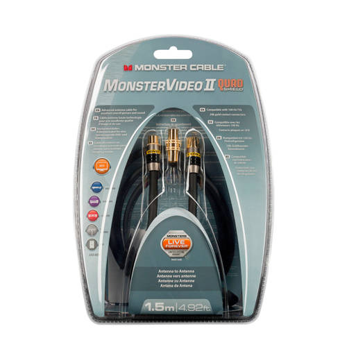 Monster Video II QuadShield antennekabel met een lengte van 1,5 meter. Door de viervoudige afscherming krijgen stoorsignalen geen kans en dankzij de Turbine connectors maakt de kabel een uitstekende verbinding met zowel de CAI doos als de televisie zelf.Specificaties:- Type: MCQUADPCX- Aansluiting 1: Coaxplug male- Aansluiting 2: Coaxplug female- Viervoudige afscherming (2x folie, 2x koperdraadnetwerk van hoge dichtheid) voor storingsvrij signaal, ook op de lange lengten- 24k vergulde Turbine connector voor optimale corrosievrije signaaldoorgifte- Precisie 75 ohm constructie voor hoogste signaal integriteit- Geschikt voor analoge en digitale televisie- Geschikt voor analoge radio- Meervoudige koperkern voor betere soepelheid en korte buigradius