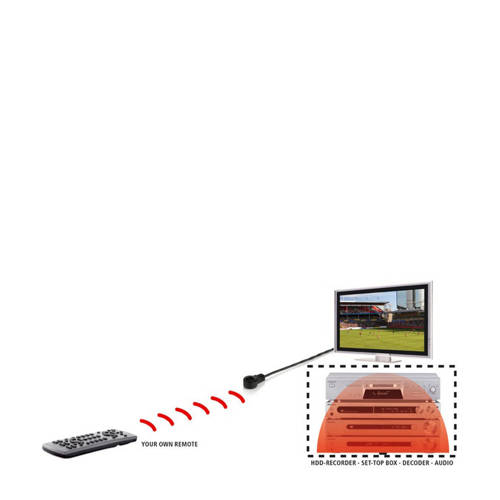 Bedien uw A/V apparaten achter gesloten kastdeurtjes (of zelfs vanuit een andere ruimte) met uw huidige afstandsbediening. Met de IR Control 10 XTRA kunt u 2 kastdelen/compartimenten en 2 extra apparaten bedienen. Met uitzondering van de zeer kleine IR ontvanger is de complete set volledig uit het zicht te plaatsen. Met IR blaster functie om meerdere apparaten met maar één IR blaster te bedienen of wanneer u geen IR LEDs op uw A/V apparatuur wilt of kunt plakken. Werkt met vrijwel alle merken en modellen en is geschikt voor nieuwe IR code formaten (zoals RC-MM) welke worden gebruikt in vele nieuwe HD apparaten en digitale TV decoders. Bevat nieuwe IR filtertechnieken voor gebruik in de buurt van Flat Screen TV’s (Plasma, LCD en LED, indirect zonlicht en spaarlampen. Plaats uw A/V apparatuur in een gesloten kastje, tv meubel of zelfs in een andere ruimte. De IR ontvanger dient in het zicht van uw eigen afstandsbediening geïnstalleerd te worden. Plak de IR blaster LED waar u maar wilt in het kastje en werk de IR hoofd module netjes weg. Richt de afstandsbediening op de IR ontvanger om het gewenste commando (via de IR hoofd module) naar de IR LED’s te sturen, deze zullen dit infrarood commando direct doorgeven aan de A/V apparatuur.