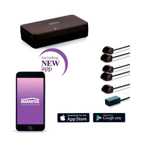 Bedien apparaten die uit het zicht staan met smartphone, tablet of afstandsbediening. Met de unieke Marmitek Invisible Control 6 XTRA | SMART kun je tot wel 8 apparaten die in een gesloten tv-meubel staan bedienen met een smartphone, tablet en/of bestaande afstandsbediening. Download de gratis Marmitek Invisible Control app en maak met het grootste gemak een zeer eenvoudige, universele afstandsbediening die iedereen bij jou thuis begrijpt.Word je tijdens het tv kijken gebeld op jouw smartphone? Geen probleem. Naast de bediening met de Invisible Control app kun je altijd jouw bestaande afstandsbediening(en) blijven gebruiken.Deze infraroodverlenger bestaat standaard uit een:- Infrarood ontvanger: ‘ontvanger’ - Infrarood module: ‘module’ - Infrarood zender: ‘zender’ (blaster led) - Bluetooth ontvanger (2e infrarood zender)De ontvanger plaats je in het zicht van jouw afstandsbediening en is verbonden met de module die je in de kast hebt geplaatst. De zender sluit je vervolgens aan op de module. Het signaal van jouw afstandsbediening wordt via de ontvanger doorgestuurd naar de module, welke het signaal weer doorstuurt naar de zender. De zender ‘bedient’ vervolgens jouw audiovisuele apparatuur. Dit zorgt ervoor dat je geen kastdeuren open hoeft te doen om jouw apparatuur te bedienen.De Bluetooth ontvanger gebruik je alleen als je de app gebruikt om je apparatuur te bedienen. Deze Bluetooth ontvanger zet het Bluetooth signaal om naar een infrarood signaal zodat je met je smartphone/tablet ook de tv aan of uit kunt zetten.- Bedien een onbeperkt aantal apparaten in een gesloten tv meubel of kast in 1 of 2 compartimenten. Bijna onzichtbaar te plaatsen mét gegarandeerde werking.- Bediening ook mogelijk met smartphone of tablet door meegeleverde app.- Commando's van bestaande afstandsbediening(en) zijn makkelijk toe te voegen.- Zeer eenvoudige en snelle installatie doorvernieuwde infrarood techniek (infrarood blaster led).- Plaats de infrarood blaster led waar je maar wilt in het kastje of tv meubel en je kunt alleaudiovisuele apparatuur in dit compartiment bedienen.- Werkt met vrijwel alle merken en modellen en is geschikt voor nieuwe infrarood code formaten (zoals RC-MM) welke worden gebruikt in vele nieuwe HD apparaten en digitale tv decoders.- Door geavanceerde filtertechnieken ongevoelig voor gebruik in de buurt van flatscreen tv’s (plasma, lcd en led) en indirect zonlicht.