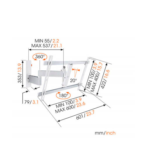 Je LED tv aan de muur? de TV Mount Guide App!Tv-beugel met draaifunctie voor tv's tot 30 kgDe WALL 3345 draaibare tv-beugel wordt veel toegepast. De WALL 3345 is geschikt om vrijwel ieder model tv van 40' tot 65' (101-165 cm) stevig aan de muur te bevestigen. Draaihoek is max 180° en kantelhoek is max 20°. Ook in wit verkrijgbaar. Dankzij de TV Mount Guide app is het bevestigen van je tv-beugel eenvoudig en veilig. Iedereen kan het.De tv beugel installatie appDe TV Mount Guide begeleidt je stap voor stap bij het installeren van je tv beugel en helpt je bij het vinden van de perfecte positie voor je tv op de muur.De TV Mount Guide gebruikt de meegeleverde poster als herkenningspunt voor het bepalen van de positie van je tv. Je kunt zo met je tablet of smartphone precies zien waar je eerst boorgat van je Vogel’s tv beugel moet komen. - Bepaal de positie van je tv met de meegeleverde poster en de TV Mount Guide app- Teken het eerste boorgat af met de behulp van de TV Mount Guide- Bekijk duidelijke instructievideo's voor het installeren van je Vogel's tv beugelJouw tv draait alle kanten opHang je tv aan de muur met een draaibare WALL tv-beugel en je kan vanuit ieder hoek optimaal tv kijken. Je draait je tv gewoon naar je toe. Je hebt nooit meer last van hinderlijke weerspiegeling. Met de WALL draaibare muurbeugel draai je de tv in iedere gewenste positie.Kenmerken:- Kantelsysteem (tot 20°) om weerspiegeling te vermijden- Draai je tv probleemloos tot 180°- Geleid je kabelsHang je tv eenvoudig waterpas, zelfs na het bevestigen- Teken het eerste boorgat gemakkelijk af met behulp van de TV Mount Guide App!