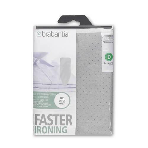 Brabantia metallic strijkplankovertrek met 2 mm schuimlaag, maatD (135 x45 cm). Gemaakt van gemetalliseerd katoen - warmtereflecterend voor een sneller resultaat. Geschikt voor normaal en stoom strijken.Makkelijk aan te brengen met koordbinder en snelspanner.- Kleur: grijs- Materiaal: gemetalliseerd katoen- Geschikt voor strijktafels met bladmaat 135 x45 cm- Machinewas- Afmeting (lxb) = 135x45 cm