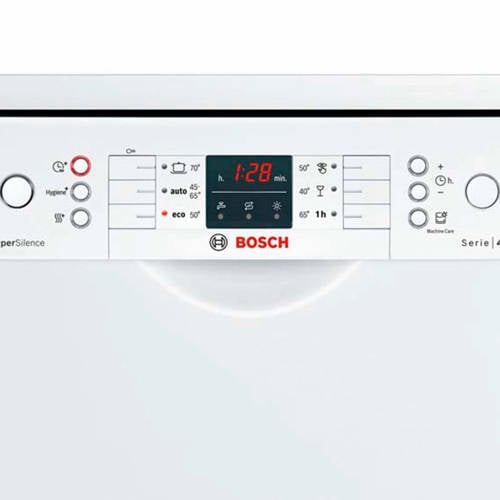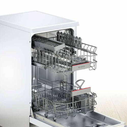 De Bosch SPS46IW07E compacte vaatwasser met energieklasse A++ met ruimte voor 9 couverts is uitgevoerd in wit en meet 45 cm breed. Handig als je niet meer plaats hebt voor een standaard breedte. Deze vaatwasser met verstelbare bovenkorf (3 standen) biedt je ruimte voor bijvoorbeeld grote borden tot 31 cm. Met de SPS46IW07E heb je de beschikking 7 programma's: Intensief 70 °C, Auto 45-65 °C, Eco 50 °C, Stil 50 °C, Glas 40 °C, 1h. TurboSpeed20, 1H 65 °C en 3 extra speciale functies te weten intensiveZone, varioSpeedPlus en Extra Droog. Bediening met behulp van digitaal display, verder met afwasmiddelherkenning , glasbeschermingstechniek, indicatie voor zout en glansspoelmiddel, startuitstel 1-24 uur. Resttijd indicatie op het display. Flexibel in te delen dankzij de VarioFlex-servieskorven en RackMatic: in hoogte verstelbare bovenkorf (3 standen). En aan de veiligheid is gedacht: met kinderbeveiliging via toetsvergrendeling en Aquastop waterbeveiliging: de meest betrouwbare waterbeveiliging met levenslange garantie. Wel zo’n prettige gedachte. Tevens beschikt de vaatwasser over een AquaSensor beladingssensor, afwasmiddelherkenning, een doseerassistent - afwasmiddel word gelijkmatig verspreid en een Eco Silence Drive koolborstelloze motor. Het bestek is overzichtelijk en gemakkelijk in te ruimen in de bestekétagère in bovenkorf of in de bestekkorf. Verder beschikt de machine over een flexibele indeling met extra ruime zilverkleurige (vario)-servieskorven. En op de koolborstelloze motor krijg je maar liefst 10 jaar garantie.VarioSpeed Plus.Gebruik de VarioSpeed Plus-functie om je vaat in een mum van tijd perfect te reinigen en te drogen. De spoeltijd wordt met één druk op de knop tot wel 66% verkort, zonder in te leveren op de reinigingsprestaties. Activeer de VarioSpeed Plus-functie wanneer je snel schoon servies nodig heeft, bijv. bij verjaardagsfeestjes.AquaSensor & -StopDe AquaSensor controleert het afwaswater permanent op de kleinste vuildeeltjes, resten van vet of afwasmiddel. Na de elektronische start van het afwasprogramma past de AquaSensor het waterverbruik voortdurend aan. De vaat wordt zo nóg glanzender schoon. Bovendien reduceert de AquaSensor het waterverbruik bij licht vervuild serviesgoed aanzienlijk. De AquaStop garandeert 100% bescherming tegen alle soorten waterschade.