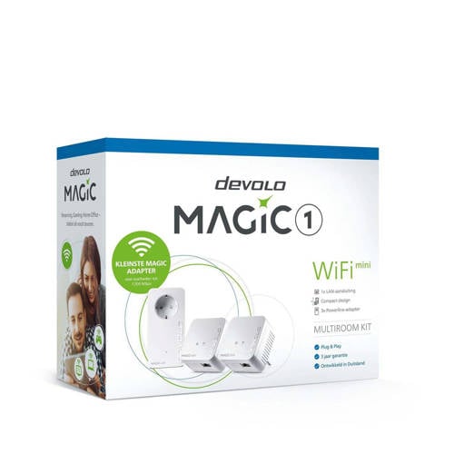 De Magic 1 WiFi mini zorgt voor een betrouwbaar en stabiel internetsignaal – precies waar u het nodig heeft. Handig: de adapter valt door het compacte design niet op – de kracht voelt u echter continu. U zult meer plezier beleven aan het streamen van series en ook de werkzaamheden in het Home Office verlopen veel vlotter.devolo Magic maakt gebruik van de innovatieve G.hn-technologie, die garant staat voor de hoogste transmissiesnelheden. Magic kan echter alleen in een pure G.hn-omgeving zijn volledige vermogen benutten, als er parallel geen andere Powerline-technologie gebruikt wordt.Zodra u de 1 WiFi mini Starter Kit heeft uitgepakt, gaat het snelSteek de adapters in een vrij stopcontact en verbind een van de adapters via LAN met uw router. Nu kunt u de seconden tellen: de Magic-adapters maken verbinding met elkaar en zijn meteen klaar voor gebruik.Integreer Magic 1 WiFi mini in uw bestaande netwerkHetzelfde geldt wanneer u de Magic 1 WiFi mini in uw bestaande Powerline-netwerk wilt integreren. De aanvullende adapter eenvoudig in het gewenste stopcontact steken, op de knop drukken – klaar. Na korte tijd heeft de Magic-adapter zich met de aanwezige adapters gesynchroniseerd en is uw netwerk direct uitgebreid.State-of-the-Art technologie: G.hnWij maken gebruik van State-of-the-Art technologie G.hn-Chips van de tweede generatie. G.hn is een nieuwe technische standaard die naast aanzienlijk hogere snelheden bij de gegevensoverdracht zorgt voor een stabielere internetverbinding. U kunt dus rustig gaan zitten om te genieten van het entertainment van de toekomst – de basis daarvoor heeft u met de Magic adapters al in huis.Streamen in HDDe eerste films met 8k-resolutie zullen al binnenkort in het streamingaanbod beschikbaar zijn.Online gamenOp het gebied van gaming verplaatst de trend zich steeds verder weg van de traditionele spelconsole naar volledige streaming via externe servers.Ideaal uitgerust voor modern vermaakMaar wanneer u een film in de hoogste resolutie of een spel met high-end graphics zonder storingen wilt spelen, heeft u een evenredig snelle transmissiesnelheid nodig. Met de Magic 1 WiFi mini en de andere Magic-adapters bent u uitstekend uitgerust voor modern entertainment.Intuïtief. Simpel. Gratis. Download nu de app!Ga aan de slag met het beste netwerk! De nieuwe devolo Home Network App opent de deur naar mogelijkheden die eerder alleen beschikbaar waren voor experts. Download simpelweg de app en ga aan de slag. De nieuwe devolo Home Network App is geschikt voor alle devolo Magic-adapters – met én zonder WiFi-functie. De app is beschikbaar voor zowel iOS- als Android-apparaten.Innovatieve technologieBeweeg u vrij door uw huis – irritante netwerkwisselingen zijn dankzij de Mesh-technologie verleden tijd. De netwerknaam en het wachtwoord zijn bij alle Wifi-zenders/accesspoints identiek en uw apparaat maakt geheel automatisch verbinding met de sterkste signaalbron.Daarnaast beschikken Magic 1 WiFi mini-adapters over een Fast Ethernet aansluiting (10/100 Mbps), om bijvoorbeeld een Smart-TV via LAN met internet te verbinden.Vertrouw op de marktleiderdevolo is één van de wereldwijd toonaangevende fabrikanten van dLAN- en WiFi-producten. Wij ontwikkelen onze techniek sinds 2002 continu verder om onze klanten een toekomstbestendige online-ervaring in het hele huis te bieden. Inmiddels zijn er ruim 40 miljoen van onze adapters in gebruik – en het worden er steeds meer. Deze cijfers zijn alleen mogelijk omdat we onze beloftes aan de klant waarmaken. Overtuig u zelf!Network Kit:- 2x devolo MAGIC 1 WiFi mini Adapter- 1x devolo MAGIC 1 LAN Adapter- 1x Installatiehandleiding- 1x Ethernetkabel (2m)