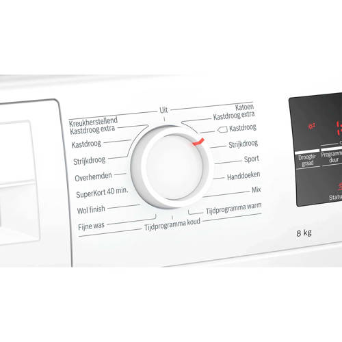 BoschWTR88T00NL warmtepompdroger met energieklasse A+++, en een maximale belading van maar liefst 8 kg. Deze wamtepompdroger droogt een volle lading sneller en beschikt over een halve beladings- en een startuitstel functie. Tevens beschikt de warmtepompdroger over een roestvrijstalen trommel met SensitiveDrying System, AntiVibration Design voor meer stabiliteit en stilte en een anti-kreukfase. Verder beschikt de machine over TouchControl toetsen en ActiveAir technologie. Verder heb je de beschikking naast de standaard programma’s over speciale programma's: Blouses/Overhemden, Fijne was, Handdoeken, mix, Superkort 40, Sport, wol finish, Tijdprogramma koud en Tijdprogramma warm.Extra groot LED display voor weergave van resttijd en instelling tot 24 uur eindtijd, programmastatus en diverse extra functies. Touch control toetsen met LED indicatie: eindtijduitstel, licht strijken, Programmaduur, voorzichtig drogen, signaal, Start / Reload / Pause, Fijninstelling droogresultaat en 24 u eindtijduitstel. Ook kun met deze toetsen de antikreukfase op 60 minuten en de kinderbeveiliging instellen. De droogtemperatuur is instelbaar je krijgt eindsignaal bij einde programma.SensitiveDrying SystemMet het SensitiveDrying System wordt de was gedroogd met een milde, warme lucht die van alle kanten de trommel binnenstroomt en zachtjes rondgedraaid met de gebogen Soft-meenemers, in plaats van plat op de optimaal vormgegeven binnenwand van de trommel te blijven liggen. Het resultaat is zacht wasgoed zonder kreuken.TouchControlDe touchControl-toetsen zien er niet alleen elegant uit maar zijn ook bijzonder makkelijk te gebruiken: slechts even aantippen is voldoende om de gewenste functie te kiezen. Een LED en een geluidssignaal bevestigen het selectieproces.ActiveAir technologieDe ActiveAir Technologie is een innovatieve verdere ontwikkeling van de bestaande droogtechniek. In tegenstelling tot condensatiedrogers maakt dit model geen gebruik van conventionele warmte. De lucht om te drogen wordt met behulp van een warmtepomp goedkoop opgewarmd, waarna deze lucht efficiënt wordt hergebruikt.