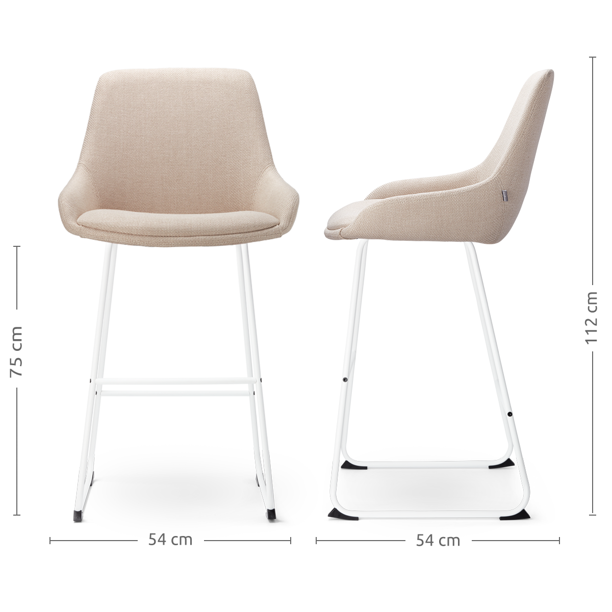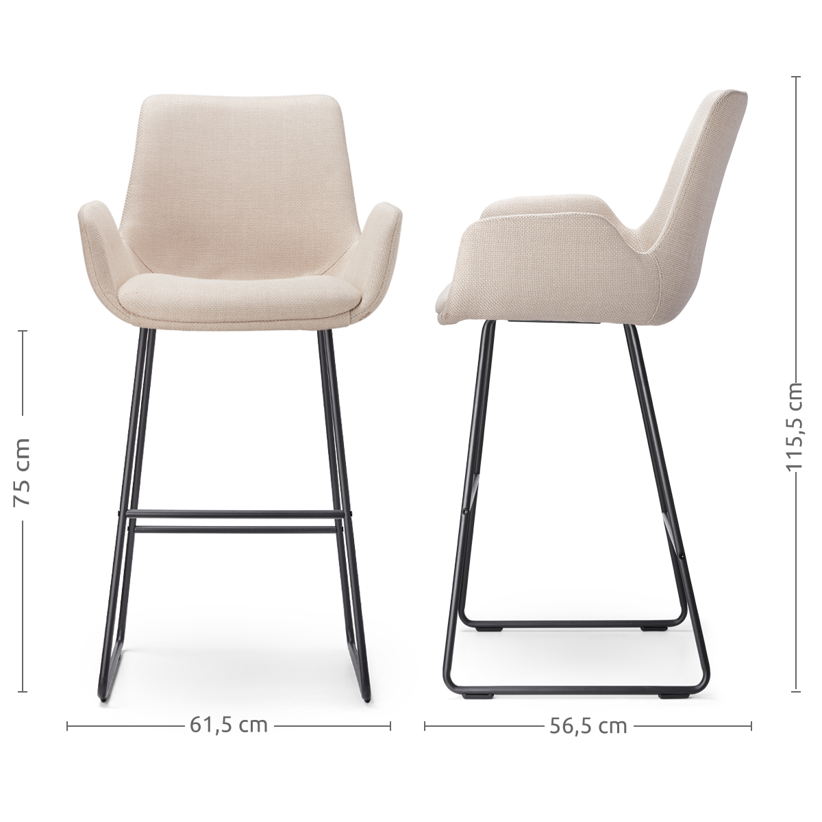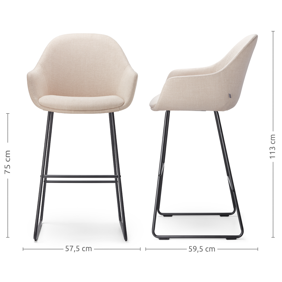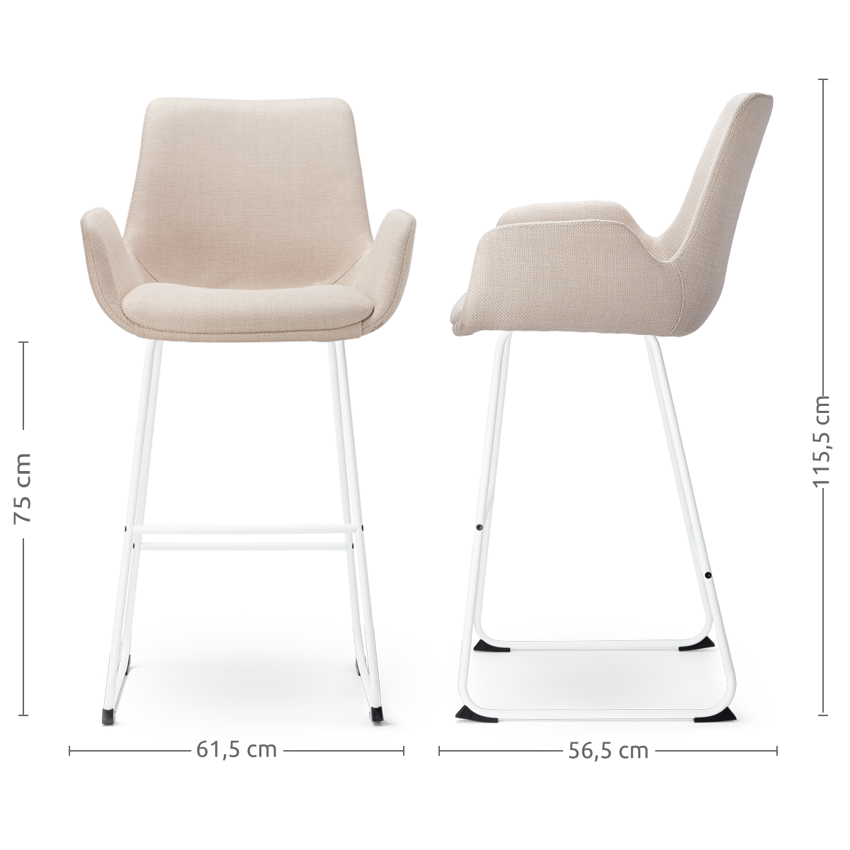 Beige barkruk van stof met Armleuning en witte poten. De Nino-Mae barkruk in beige stof met witte poten is een prachtige toevoeging aan iedere moderne keuken of bar. De zitting, volledig gestoffeerd en voorzien van een zachte textuur, zorgt voor een ultiem zitcomfort. Dankzij de ergonomische vormgeving, inclusief armleuningen en een praktische voetsteun, kun je ontspannen genieten van je maaltijden of gesprekken. De Scandinavische uitstraling van de witte metalen poten geeft de barkruk een minimalistisch en elegant karakter. Met een zithoogte van 75 cm is deze barkruk perfect voor hoge eettafels en bars met een bladhoogte tussen de 98 en 105 cm. Het sterke houten binnenwerk van de zitting biedt extra stabiliteit en een lange levensduur, terwijl het luchtige ontwerp ervoor zorgt dat de ruimte open en ruimtelijk blijft. Onderhoudsadvies voor een lange levensduur Impregneer de stoffen zitting voor gebruik om vlekken te voorkomen en de stof langer