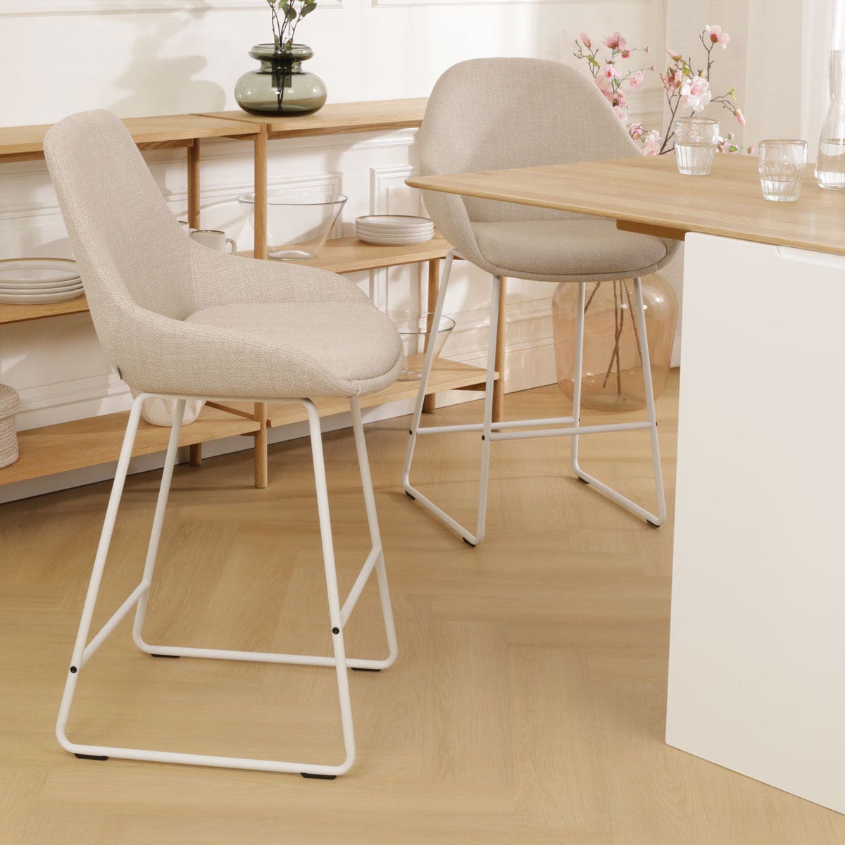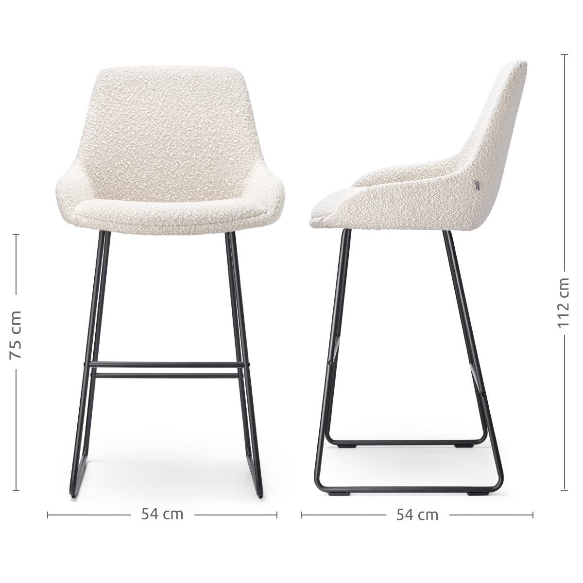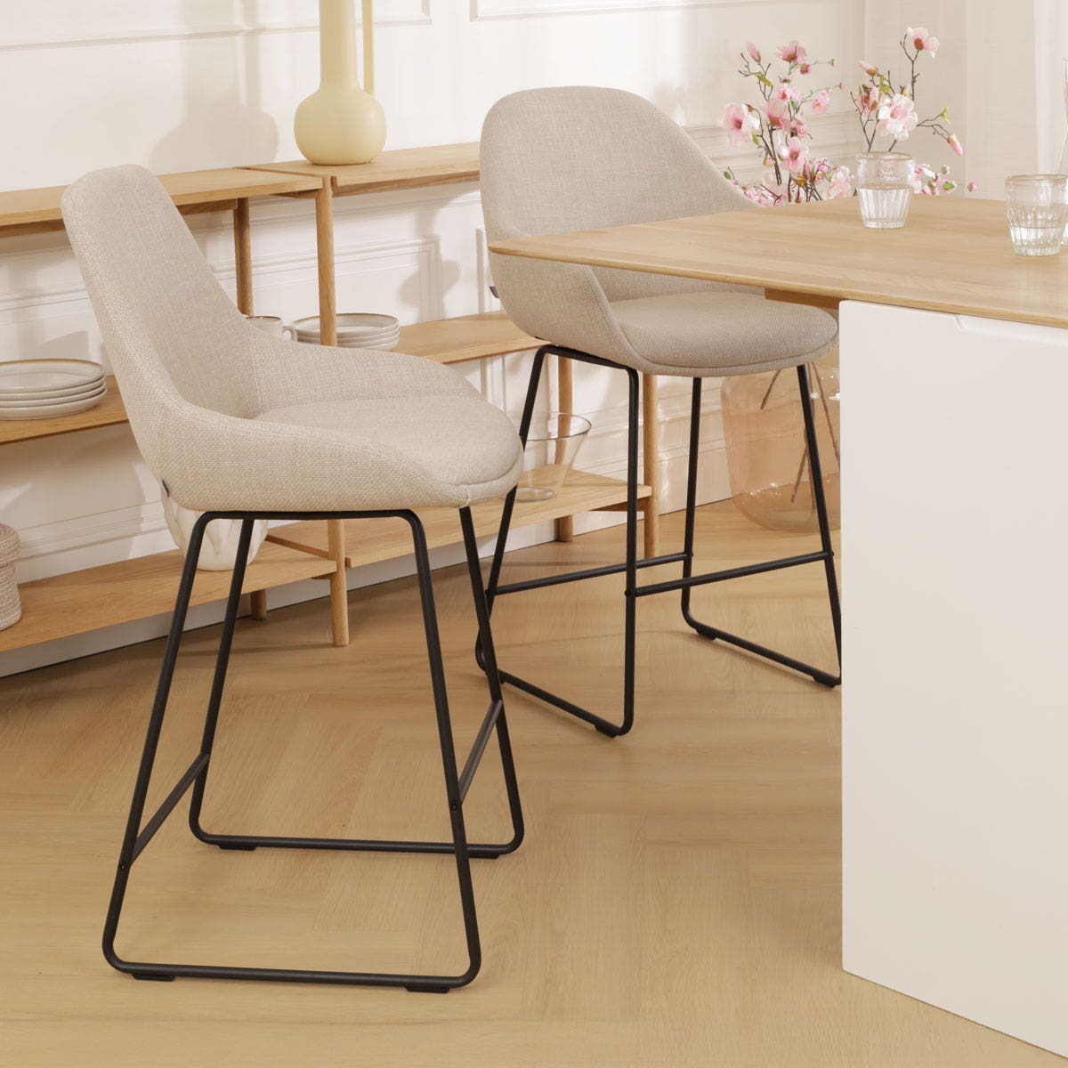 De Nino-Isa barkruk in beige met een zwart onderstel is een stijlvolle en functionele toevoeging aan je keuken of eetruimte.Deze Scandinavisch geïnspireerde barkruk, met een zithoogte van 65 cm, biedt een luxe uitstraling dankzij de volledig gestoffeerde zitting met rijke bouclé stof. De slanke metalen poten, die ook in wit verkrijgbaar zijn, zorgen voor stevigheid en een moderne uitstraling. Met een totale hoogte van 102 cm en een zitdiepte van 40 cm, past de barkruk perfect aan een kookeiland of keukenblad van ongeveer 88-95 cm hoog. De barkruk is zonder armleuningen, waardoor hij gemakkelijk onder het keukenblad kan worden geschoven, ideaal voor beperkte ruimtes. Het ontwerp zonder armleuningen maakt dat de kruk minder ruimte inneemt en hij is zeer eenvoudig in elkaar te zetten. Dankzij de ergonomische zitvormen en de voetsteun geniet je van optimaal comfort tijdens het dineren. De Nino-Isa is geen onderdeel van een set, waardoor je vrij bent om je interieur naar
