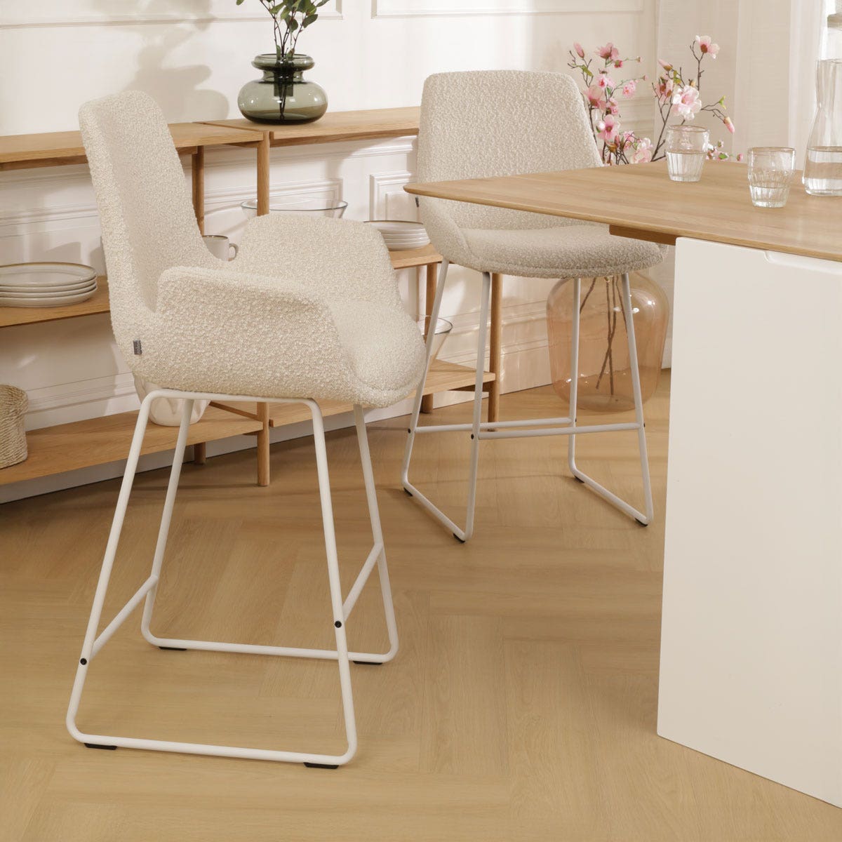 Moderne beige bouclé barkruk met witte poten en armleuning. De Nino-Mae barkruk is een stijlvolle en praktische keuze voor iedere bar of hoog kookeiland. Met een zithoogte van 75 cm en een comfortabele bouclé bekleding in beige past deze barkruk perfect in moderne en Scandinavische interieurs. De zachte, volledig gestoffeerde zitting is voorzien van geïntegreerde armleuningen, wat zorgt voor een ontspannen zitervaring. Het ergonomische ontwerp en het stevige houten binnenwerk bieden uitstekende ondersteuning, waardoor je uren comfortabel kunt zitten. De witte metalen poten geven de barkruk een strak en eigentijds uiterlijk, terwijl de geïntegreerde voetsteun extra comfort biedt. Dankzij het minimalistische design blijft je ruimte luchtig en overzichtelijk, zonder concessies te doen aan functionaliteit. Of je nu een modern appartement hebt of een gezellig landelijk interieur, de Nino-Mae barkruk voegt direct een vleugje luxe toe aan je inrichting. Tips