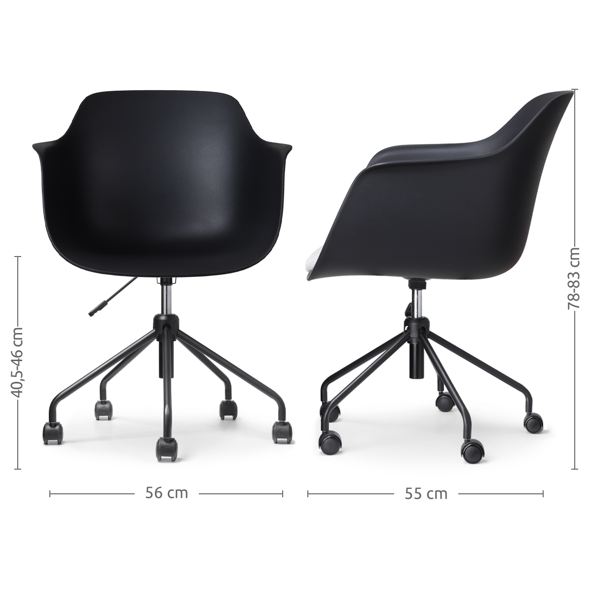 De Nout-Puk bureaustoel zwart met zwart onderstel van Nolon combineert stijl en comfort op indrukwekkende wijze.Deze moderne bureaustoel heeft een strak en Scandinavisch design, waardoor hij perfect past in elke thuiswerkplek of kantooromgeving. De kunststof kuipzitting met armleuningen biedt uitstekende ondersteuning voor het lichaam, terwijl de zitting dankzij het flexibele materiaal meebeweegt voor extra comfort. Het metalen onderstel met zwarte poten is niet alleen stevig, maar ook voorzien van een 360-graden draaimechanisme en in hoogte verstelbaar van 40,5 tot 46 cm, zodat je altijd de perfecte zithouding vindt. De Nout-Puk is 83 cm hoog, met een zithoogte van 46 cm en een zitdiepte van 46 cm. Met zijn duurzame en onderhoudsvriendelijke ontwerp is deze bureaustoel een ideale keuze voor wie op zoek is naar een comfortabele en stijlvolle zitoplossing. Beschikbaar in zowel een compleet zwarte uitvoering als in andere kleurcombinaties, biedt de stoel ook opties