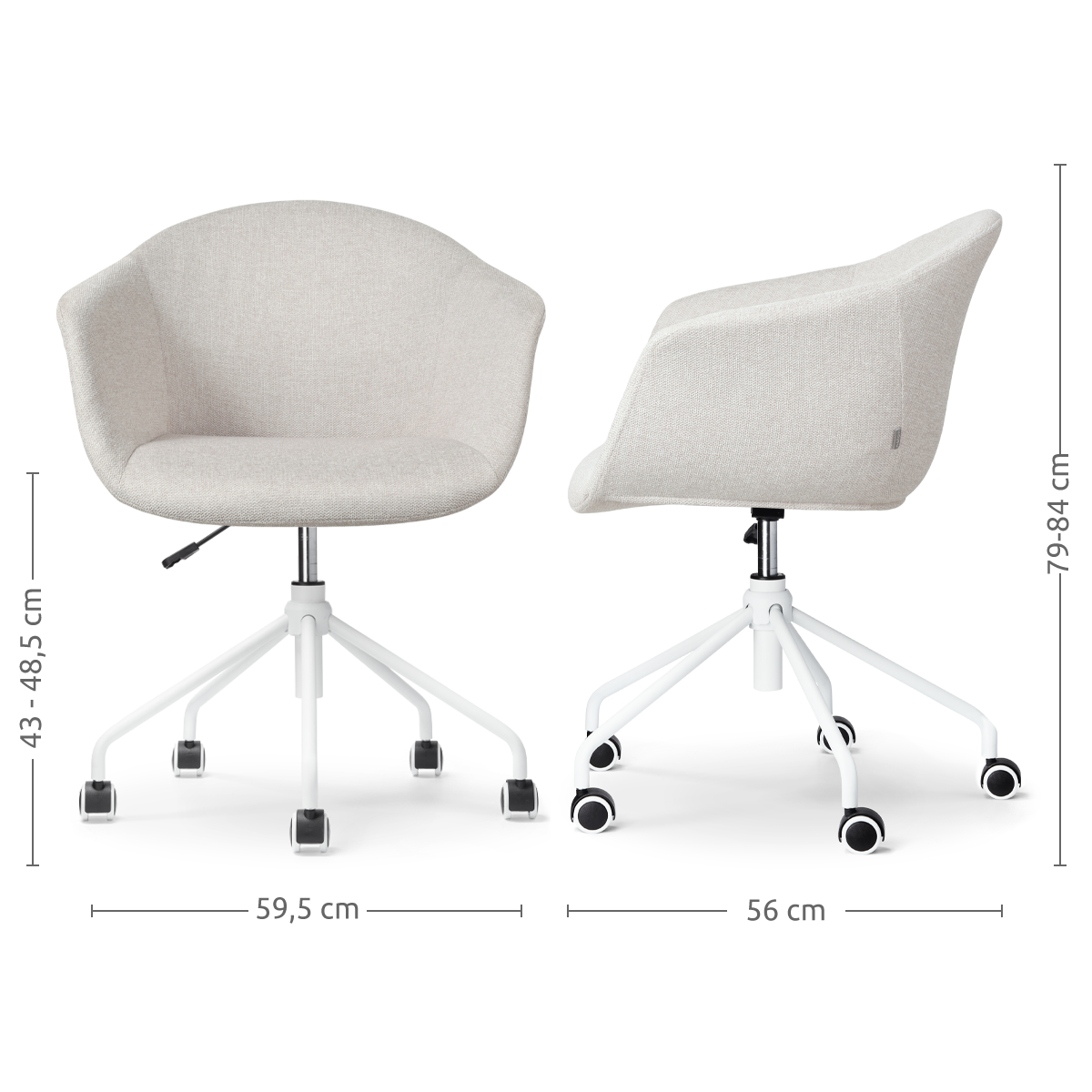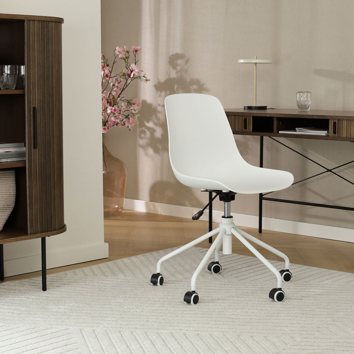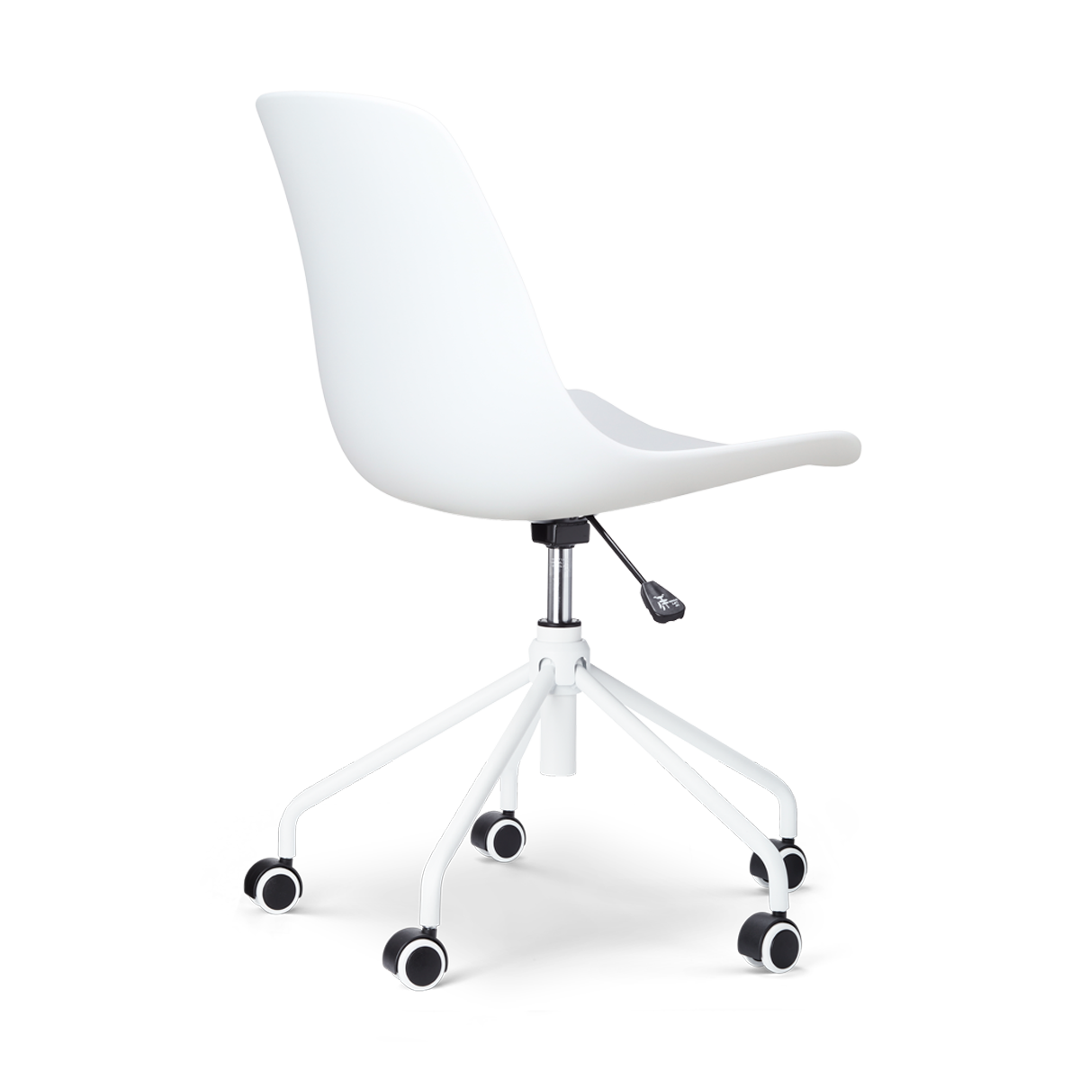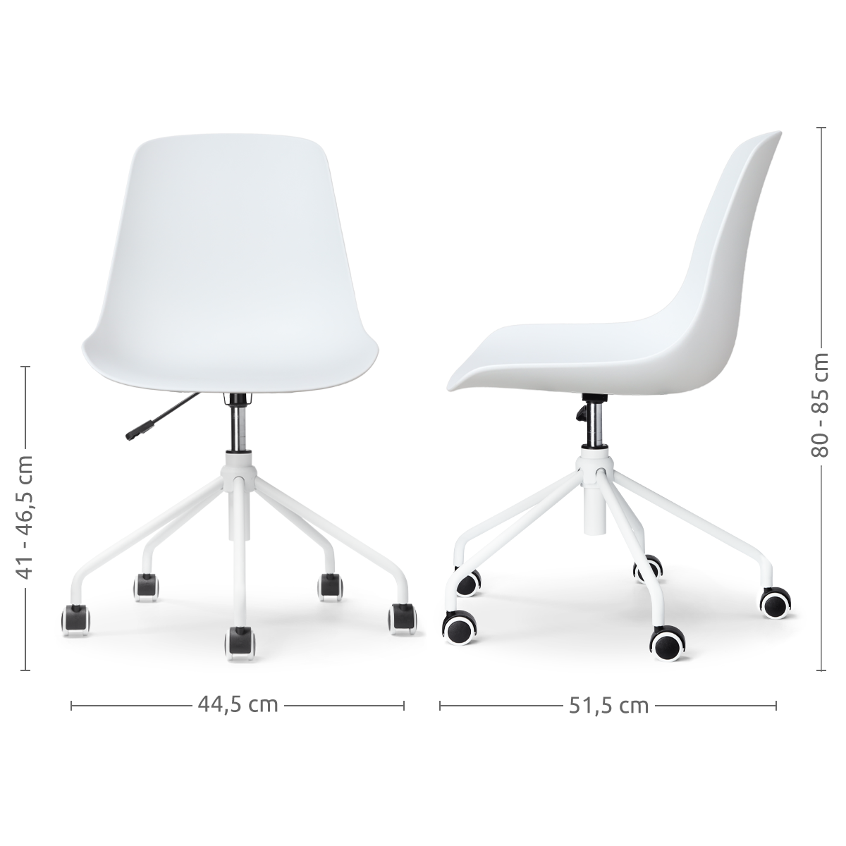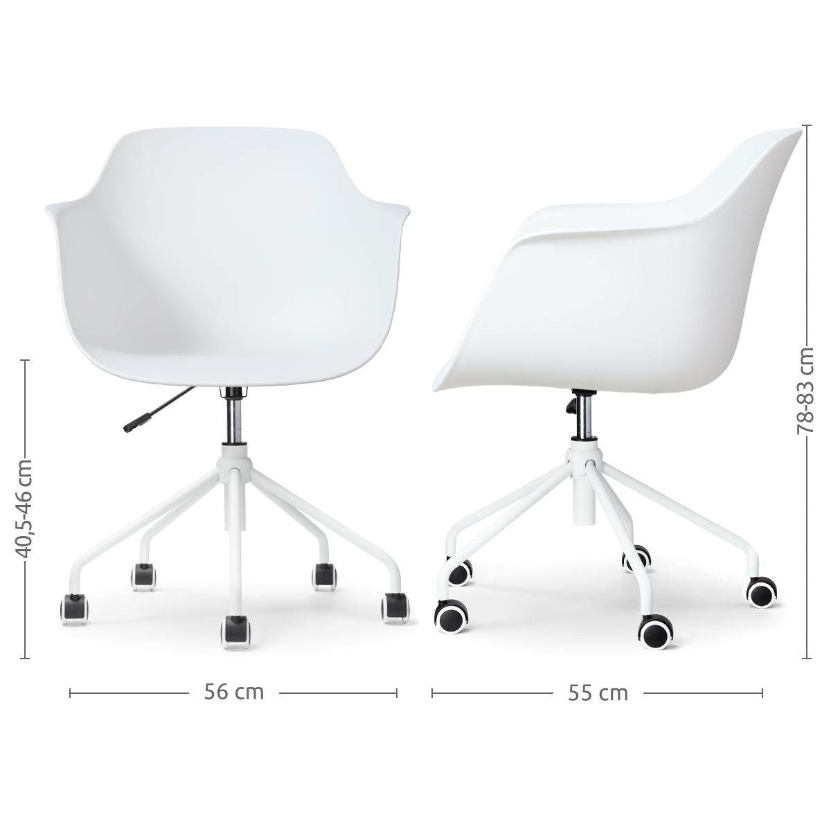 De Nout-Puk bureaustoel wit - wit onderstel van het merk Nolon combineert stijl met functionaliteit, perfect voor iedere moderne en industriële werkplek.Deze Scandinavisch geïnspireerde bureaustoel is uitgerust met een kunststof zitting die niet alleen comfortabel maar ook duurzaam is. Het metalen onderstel met witte poten zorgt voor stabiliteit en is voorzien van handige wieltjes, ideaal voor een flexibele werkplek. Met zijn verstelbare zithoogte van 40,5 tot 46 cm en een totale hoogte van 82 cm, kan de stoel eenvoudig worden aangepast aan jouw voorkeuren. De zitting, die 46 cm diep is, biedt voldoende ondersteuning, terwijl de armleuningen extra comfort geven tijdens het werken. Dankzij het 360-graden draaimechanisme is deze stoel niet alleen praktisch, maar ook perfect voor een actieve werkhouding. Zijn moderne en tijdloze design laat deze bureaustoel moeiteloos in elk interieur passen, waarbij de kunststof zitting en het wit metalen onderstel een minimalistische
