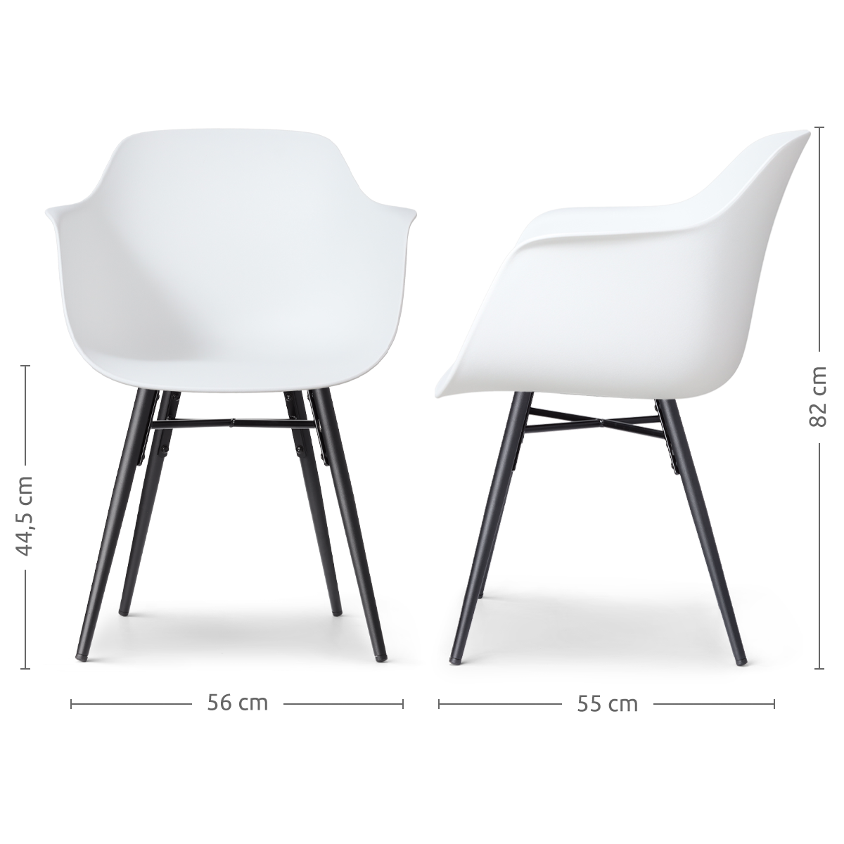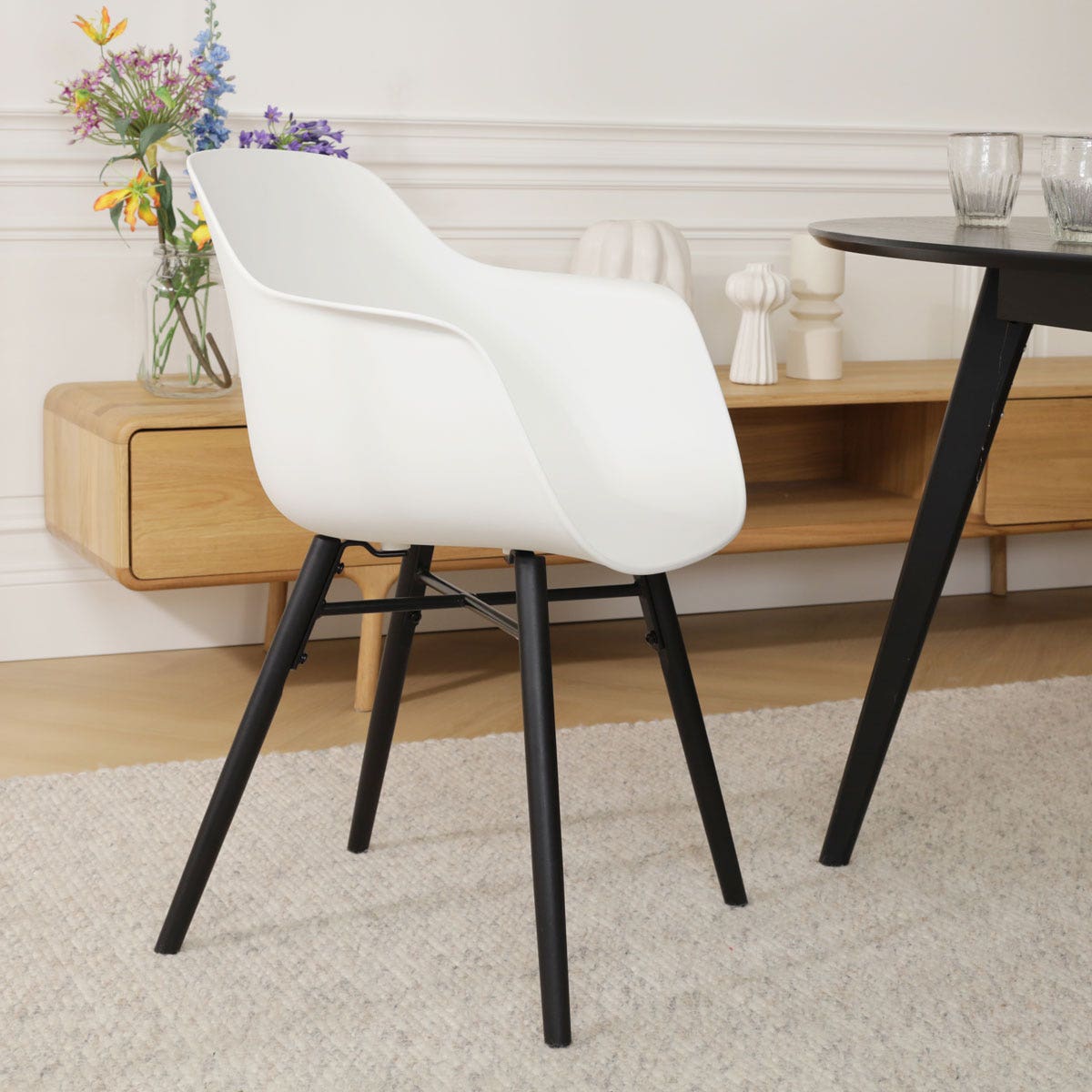 De Nena-Puk eetkamerstoel in wit met een zwart houten onderstel is een trendy en stoere toevoeging aan je interieur.Deze Scandinavisch geïnspireerde kuipstoel combineert stijl met comfort en biedt een ontspannen zithouding dankzij de ergonomische kunststof zitting met armleuningen. Met een hoogte van 82 cm, een zithoogte van 45 cm, en een zitdiepte van 46 cm, is deze stoel perfect voor lange diners aan de eettafel. Het niet-draaibare ontwerp zorgt voor stabiliteit, terwijl de zwarte beukenhouten poten met metalen kruisverbinding een stevige basis vormen. De door en door gekleurde kunststof zitting in wit is praktisch en onderhoudsvriendelijk, ideaal voor intensief gebruik. Of je nu een moderne of klassieke eetkamer hebt, de Nena-Puk eetkamerstoel past naadloos in elke ruimte en biedt een comfortabele zitervaring. Onderhoud en advies De zitting van de Nena-Puk eetkamerstoel is gemaakt van door en door gekleurd kunststof, waardoor