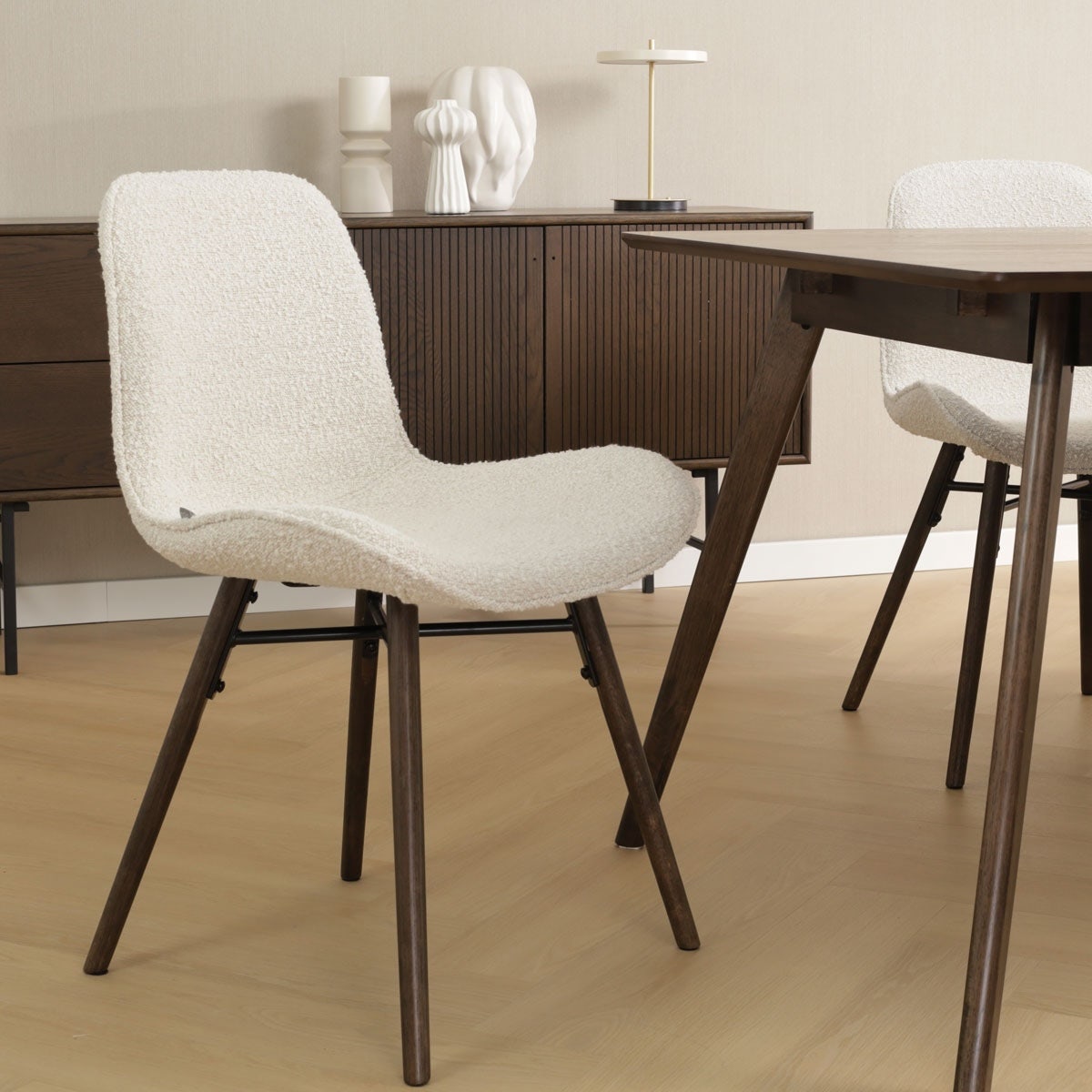 Nena Fé eetkamerstoel bouclé beige walnoot houten onderstel