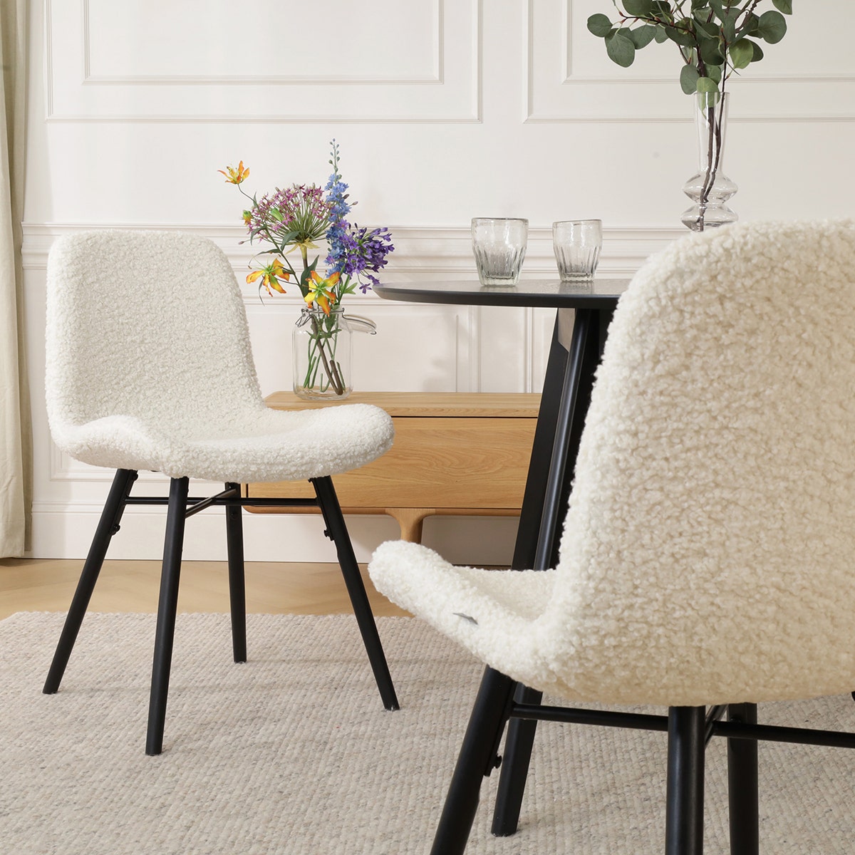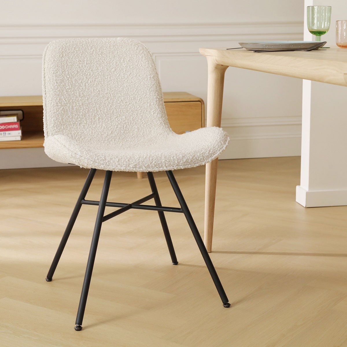 Nora Fé eetkamerstoel bouclé beige zwart onderstel