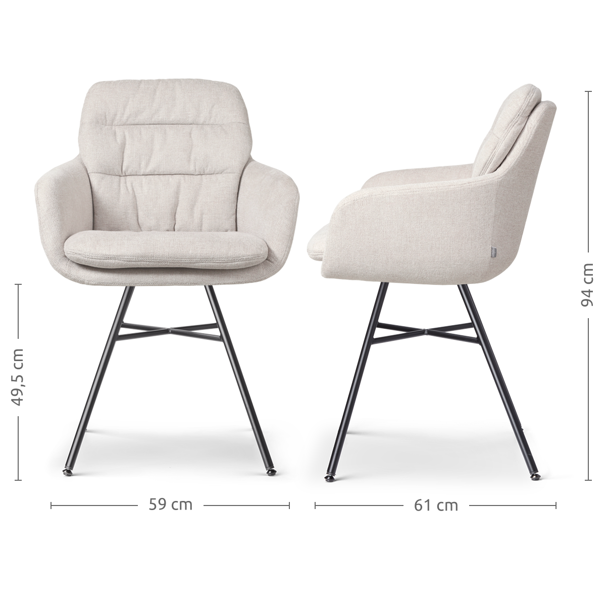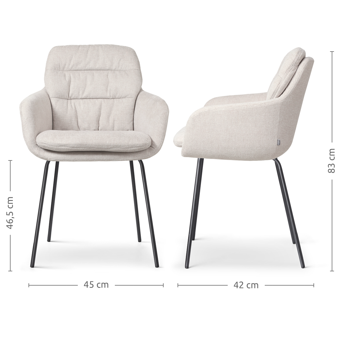 De set van twee Noa-Mia eetkamerstoelen van Nolon is de ideale toevoeging aan jouw eethoek als je op zoek bent naar comfortabele en stijlvolle eetkamerstoelen. Het metalen onderstel met kruisverbinding heeft een stoere uitstraling en is voorzien van verstelbare voetpootjes, zodat de stoel op elke plek in huis stabiel staat. De gestoffeerde zitting is ontworpen met een hoge rugleuning en armleuningen voor optimaal comfort tijdens gezellig avonden en diners. Het vaste zitkussen draagt hier eveneens aan bij, maar zorgt er wel voor dat de zithoogte iets hoger is dan gemiddeld. Met de luxe stoffen bekleding en de zachte zitting zorgt deze stoel voor een warme sfeer in de eethoek. Of je nu kiest voor de beige of grijze bekleding, de Noa-Mia eetkamerstoel nodigt uit tot gezellig tafelen en uitgebreid dineren. Voordelen en tips Set van 2 eetkamerstoelen Metalen onderstel met kruisverbinding tussen de poten De voetpootjes zijn