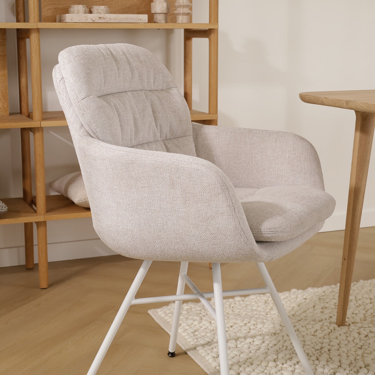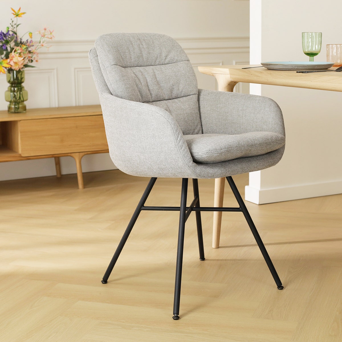 Op zoek naar comfortabele eetkamerstoelen met armleuningen? Ontmoet de set van twee Nola-Mia eetkamerstoelen van Nolon! Deze eetkamerstoel heeft een metalen frame met een draaibare poot. Het onderstel van de draaibare eetkamerstoel heeft geen terugdraaifunctie, waardoor de zitting 360 graden op het onderstel kan draaien. Dit biedt veel flexibiliteit aan tafel en zorgt ervoor dat je de stoel niet helemaal naar achteren hoeft te schuiven. De comfortabele zitting is volledig bekleed met zachte stof en is verkrijgbaar in beige en grijs. De hoge rugleuning zorgt voor veel ondersteuning, net als het vaste zitkussen en de armleuningen. Urenlang natafelen is met de Nola-Mia eetkamerstoel dus geen probleem. Voordelen en tips Set van 2 eetkamerstoelen Draaibaar onderstel gemaakt van metaal Geen terugdraaifunctie: de zitting draait 360 graden op het onderstel Deze eetkamerstoel is niet in hoogte verstelbaar De zitting