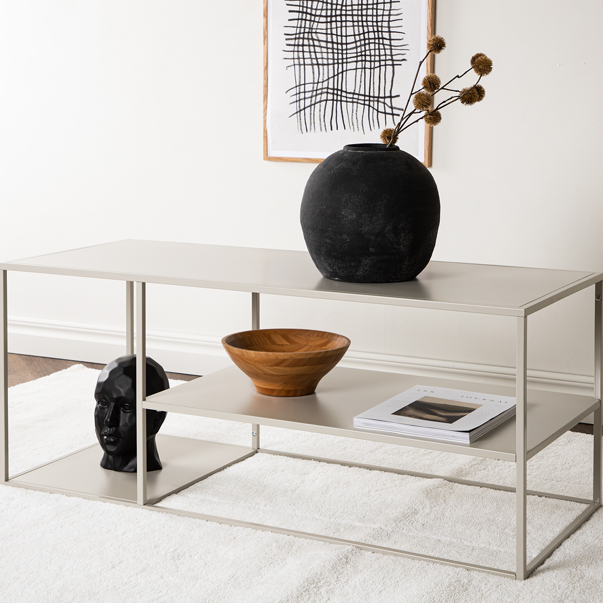 Vernieuw je interieur met deze moderne salontafel Jesse van het merk Nest living. Deze rechthoekige salontafel heeft een minimalistisch design dat moeiteloos past in een modern of industrieel interieur. Daarnaast is deze tafel gemaakt van hoogwaardig metaal, waardoor hij duurzaam en stabiel is. Dankzij de neutrale kleur past deze beige salontafel bij diverse kleurenpaletten. De tafel heeft een royale afmeting van 120 x 55 cm en biedt onder het tafelblad extra opbergruimte voor bijvoorbeeld tijdschriften of een leuke plaid. Dankzij het veelzijdige ontwerp is de Jesse salontafel niet alleen perfect voor de woonkamer, maar ook geschikt voor andere ruimtes zoals een kantoor of wachtkamer. Als tv-meubel is deze moderne salontafel ook absoluut geschikt.  Voordelen en tips Rechthoekige metalen salontafelGemaakt van duurzaam metaal Makkelijk te combineren met andere meubels dankzij de neutrale beige kleur Extra handig: