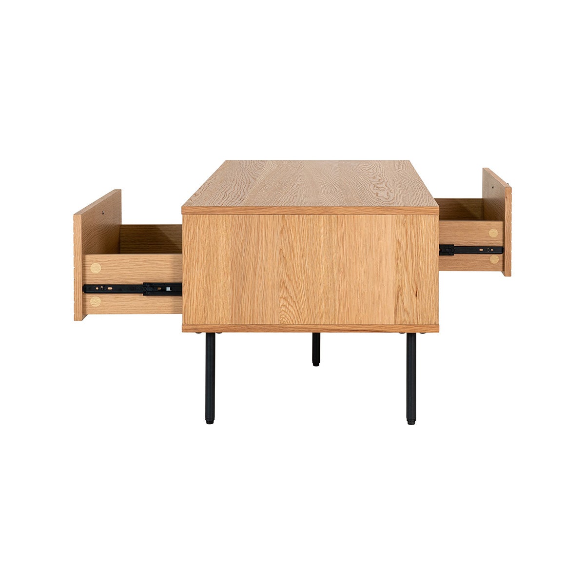 De houten salontafel Ruben van Artichok is een stijlvolle salontafel met handige opbergruimte. Deze koffietafel heeft aan beide zijden namelijk zowel een lade als een opbergvak waar je spullen in kan bewaren. Zo houd je je woonkamer netjes opgeruimd en heb je handige spullen altijd bij de hand. De salontafel is gemaakt van hout met een laag eikenfineer en heeft daardoor een warme en natuurlijke uitstraling. De ronde metalen pootjes in zwarte kleur geven het design een stoere twist, terwijl de horizontale latjes op de lades het geheel een moderne uitstraling geven. De Ruben salontafel met lades is dus een praktische en stijlvolle toevoeging aan jouw zithoek. Voordelen en tips Rechthoekige houten salontafel Gemaakt van hout met een laag eikenfineer De zwarte metalen pootjes geven het geheel een luchtige uitstraling Ontworpen met twee lades en twee opbergvakken Extra functioneel dankzij de handige