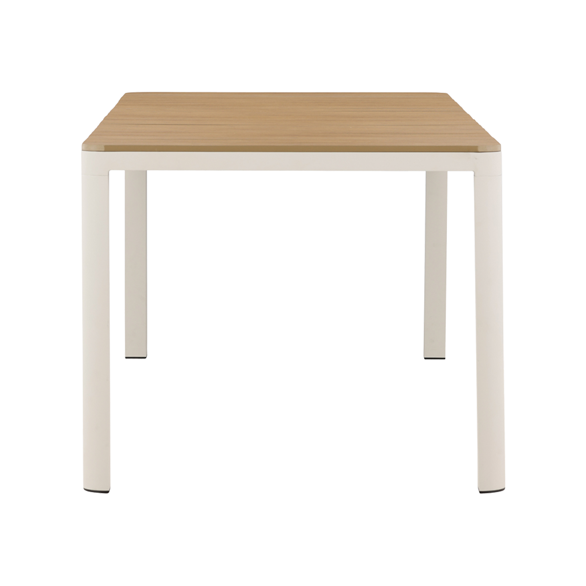 De Joas tuin eettafel van Nest Outdoor is een stijlvolle en praktische keuze voor kleinere buitenruimtes – met een strak design, duurzame materialen en een warme, rustige uitstraling. Met een formaat van 140 x 90 cm is deze compacte variant van de Joas perfect voor vier personen. Ideaal voor op een balkon, knus terras of kleinere tuin, zonder in te leveren op uitstraling of kwaliteit. Het frame is gemaakt van lichtgewicht aluminium, dat bestand is tegen weer en wind én makkelijk te verplaatsen is. Het tafelblad is uitgevoerd in polywood – een sterk, onderhoudsvriendelijk materiaal met de uitstraling van hout. Polywood is een kunststof dat UV-bestendig is, niet splintert en nauwelijks onderhoud vraagt. Zo geniet je van een houten look, zonder het gedoe van schuren of lakken.  Let wel op: laat glazen niet te lang in de zon staan op een polywood tafel. Hierdoor kan een vergrootglaseffect optreden waardoor er smeltplekken ontstaan op het tafelblad. Ook hete