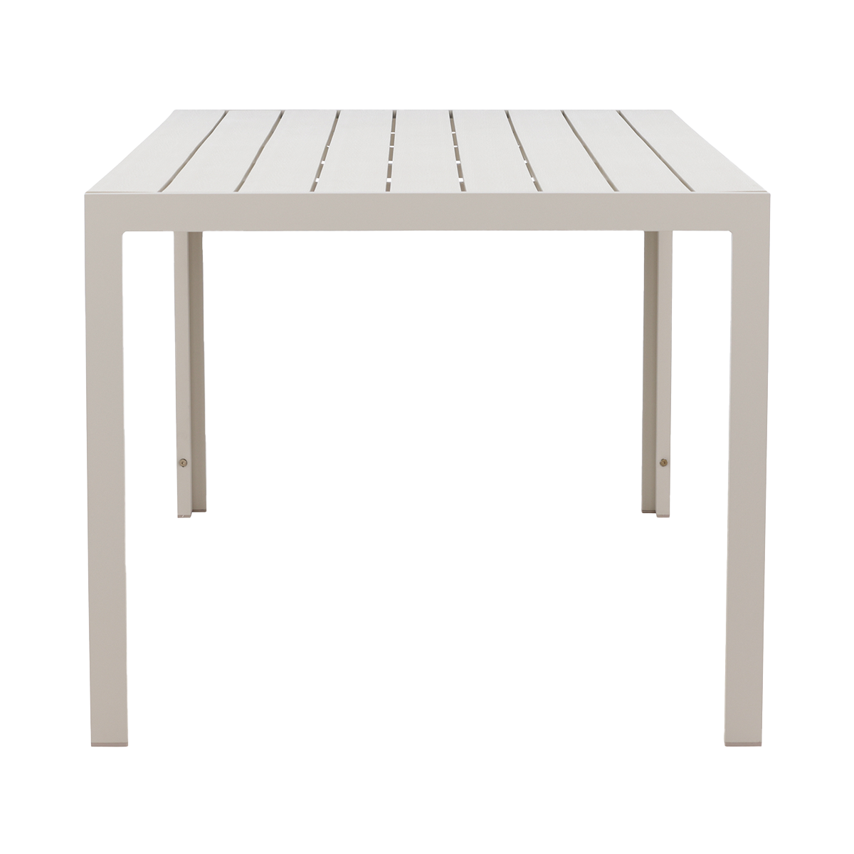 De Joas tuin eettafel van Nest Outdoor combineert een strak design met duurzame materialen – perfect voor buiten, en groot genoeg om met het hele gezelschap aan te schuiven. Met een lengte van 205 cm biedt deze tafel royaal plaats aan zes tot acht personen. Het minimalistische ontwerp zorgt voor een rustige en moderne uitstraling, terwijl de zachte beige kleur warmte en rust brengt in je tuin of op je terras. De tafel is opgebouwd uit een aluminium frame en een polywood tafelblad. Aluminium is licht, roestvrij en weerbestendig – ideaal voor buitengebruik. Het polywood blad ziet eruit als hout, maar is gemaakt van een onderhoudsvriendelijk en duurzaam kunststofcomposiet. Zo geniet je van de uitstraling van hout, zonder het intensieve onderhoud. Polywood is UV-bestendig, splintert niet en is eenvoudig schoon te maken. Dat maakt het perfect voor dagelijks buitenleven. Let wel op: laat glazen niet te lang in de zon staan op een polywood tafel. Hierdoor kan een