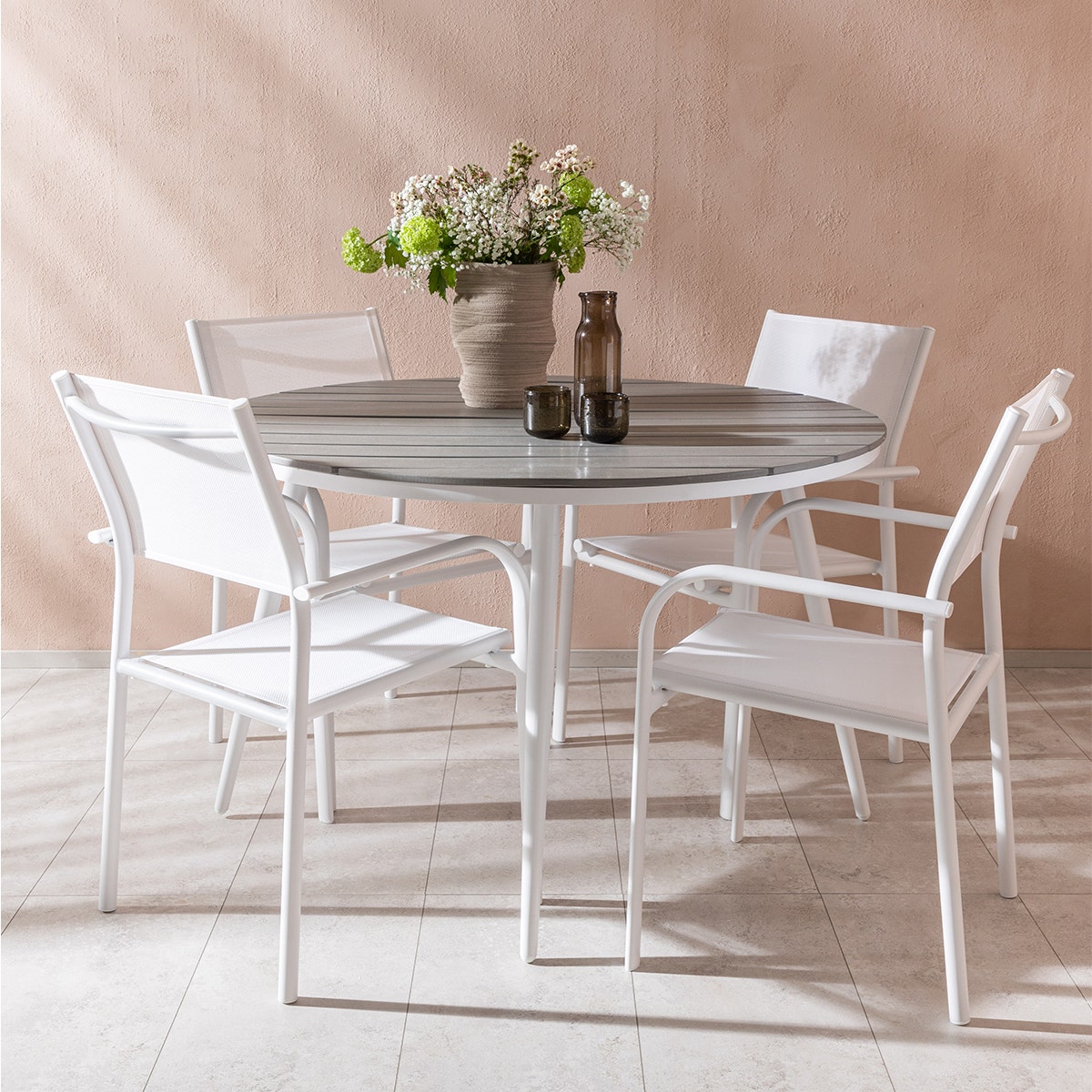 De Aaron tuintafel van Nest outdoor is de perfecte tafel als je het gezellig wil maken in de tuin. Het frame en de poten van de tuintafel zijn gemaakt van aluminium met een witte poedercoating. Het tafelblad is gemaakt van polywood latjes. Dit is een kunststof materiaal met de houtlook afwerking. Hierdoor heeft de tuintafel alle voordelen die bij kunststof tuinmeubels horen maar wel de uitstraling van een houten meubel. Het beste van beide werelden dus! Deze moderne tuintafel biedt plek aan vier personen en heeft het ideale formaat voor een kleiner terras. Combineer deze eettafel voor buiten met een set mooie tuinstoelen en jouw buitenruimte is helemaal klaar voor het zomerse weer. Is wit niet helemaal jouw kleur? De Aaron tuintafel is ook in diverse afmetingen in het zwart verkrijgbaar. Let op: laat glazen niet te lang in de zon staan op een polywood tafelblad. Hierdoor kan een vergrootglaseffect optreden waardoor er smeltplekken ontstaan. Ook hete voorwerpen zoals