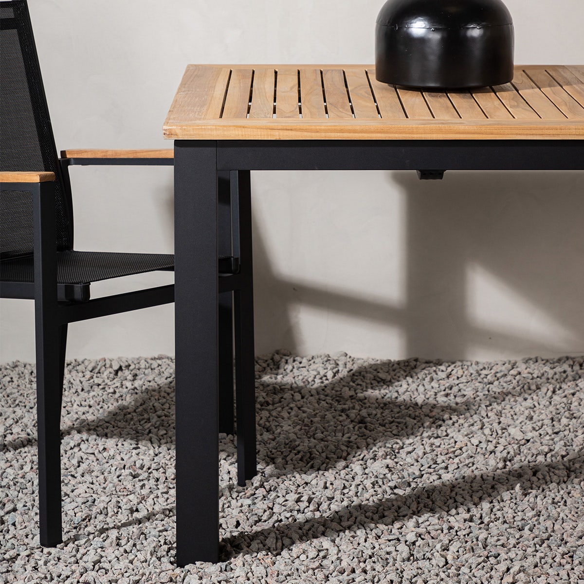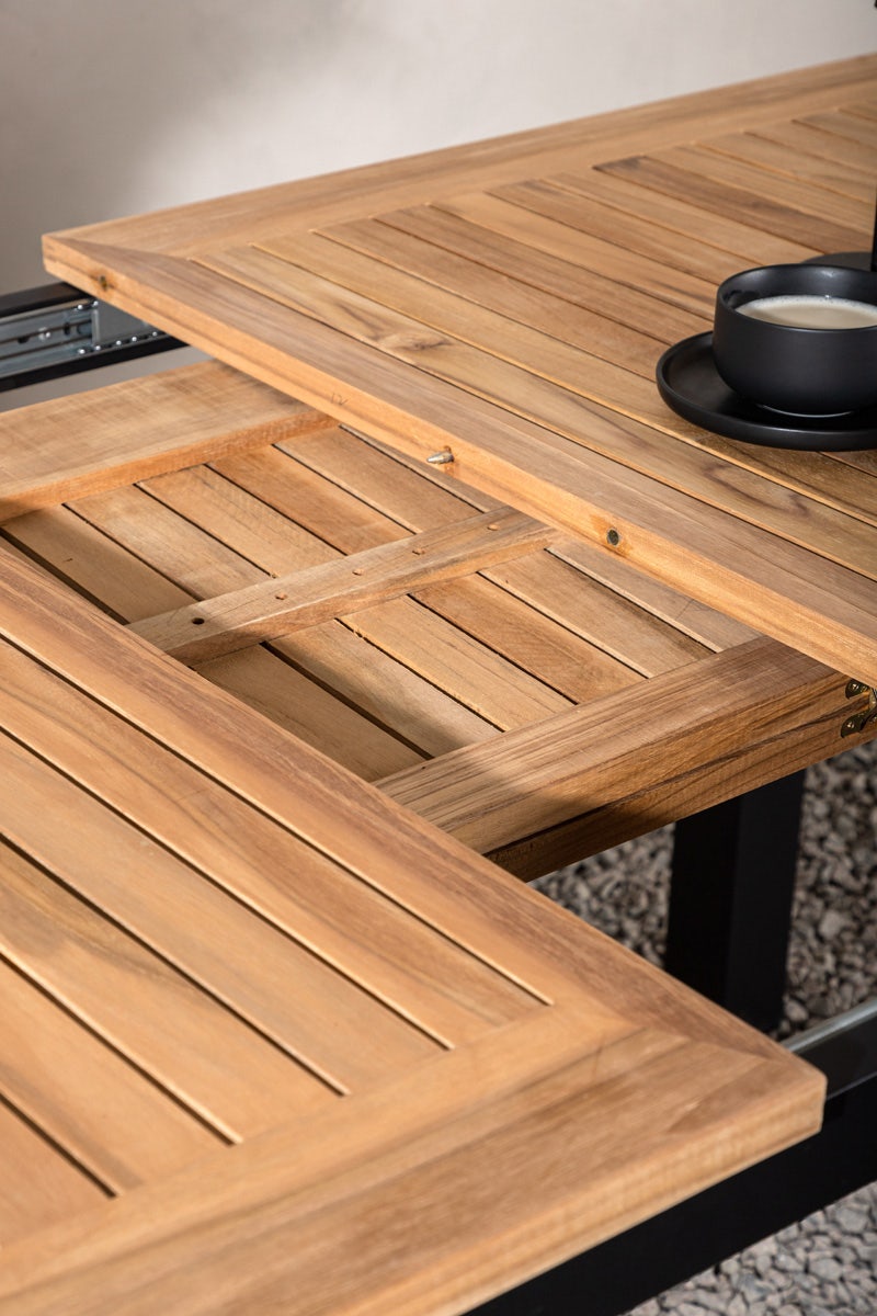 De Arvin uitschuifbare tuintafel met houten tafelblad van Nest outdoor is de perfecte aanvulling voor jouw achtertuin. Met deze praktische en onderhoudsvriendelijke eettafel voor buiten creëer je in een handomdraai meer zitplaatsen in de tuin. De Arvin tuintafel is namelijk uitschuifbaar van 152 tot 210 centimeter. Om de tafel te verlengen schuif je de twee helften van het tafelblad uiteen zodat het vlindersysteem zichtbaar wordt. Het extra stuk blad is dus gewoon opgeborgen onder het tafelblad, erg handig! Is het bezoek weer naar huis? Klap het verlengstuk dan weer naar binnen zodat de tafel teruggaat naar zijn oorspronkelijke lengte. Naast het teakhouten tafelblad heeft de tuintafel een zwart frame gemaakt van aluminium. Deze combinatie van materialen zorgt voor een moderne en stoere uitstraling op het terras. Het houten blad zorgt tegelijkertijd voor een warme uitstraling en vergt bovendien slechts af en toe onderhoud. Voordelen en