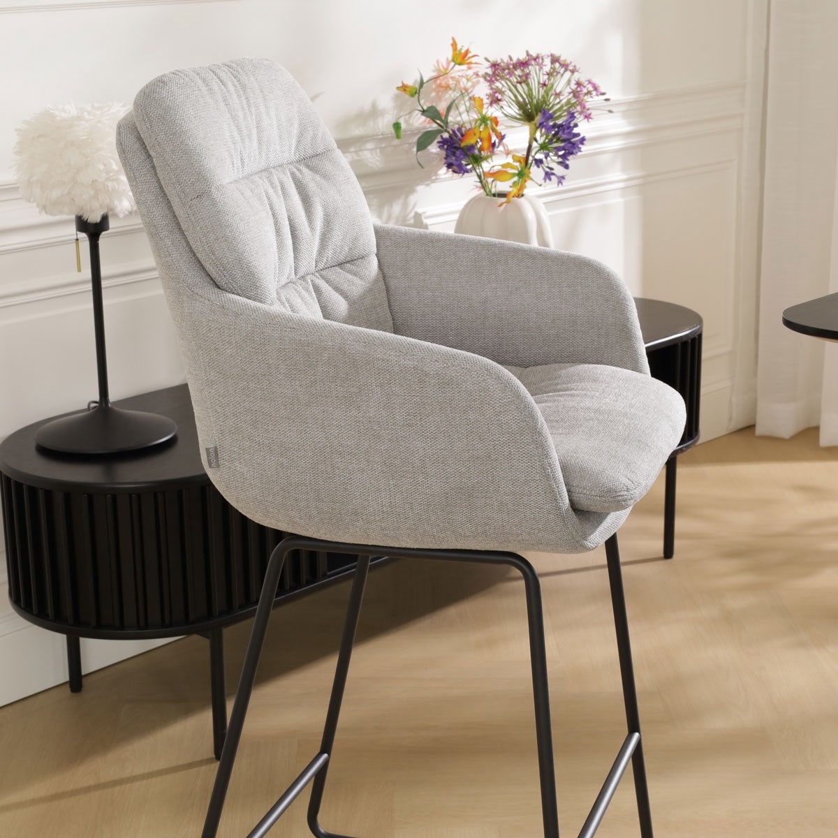Heerlijk genieten van je kopje koffie of de krant aan het kookeiland doe je met de set van twee Nino-Mae barkrukken van Nolon. Deze kookeiland barkruk heeft een comfortabele stoffen zitting met armleuningen, waardoor je zacht en ontspannen zit. Dankzij de geïntegreerde armleuningen en een zachte, goed gevoerde zitting, biedt deze barkruk ultiem comfort. Ook het stevige houten binnenwerk en de ergonomische vorm dragen daaraan bij. Het eigentijdse metalen onderstel van deze barkruk is niet alleen stabiel, maar voegt ook een moderne uitstraling toe aan je keuken. Met een zithoogte van 65 cm is deze kruk ideaal voor aan een kookeiland. Of je nu een modern, industrieel, of klassiek interieur hebt, deze de Nino-Mae barkruk vormt in elke woonstijl een mooie toevoeging. Voordelen en tips Set van 2 barkrukken Strak en modern metalen barkruk onderstel met mooie rondingen Dankzij de zithoogte van 65 cm geschikt voor aan een kookeiland of