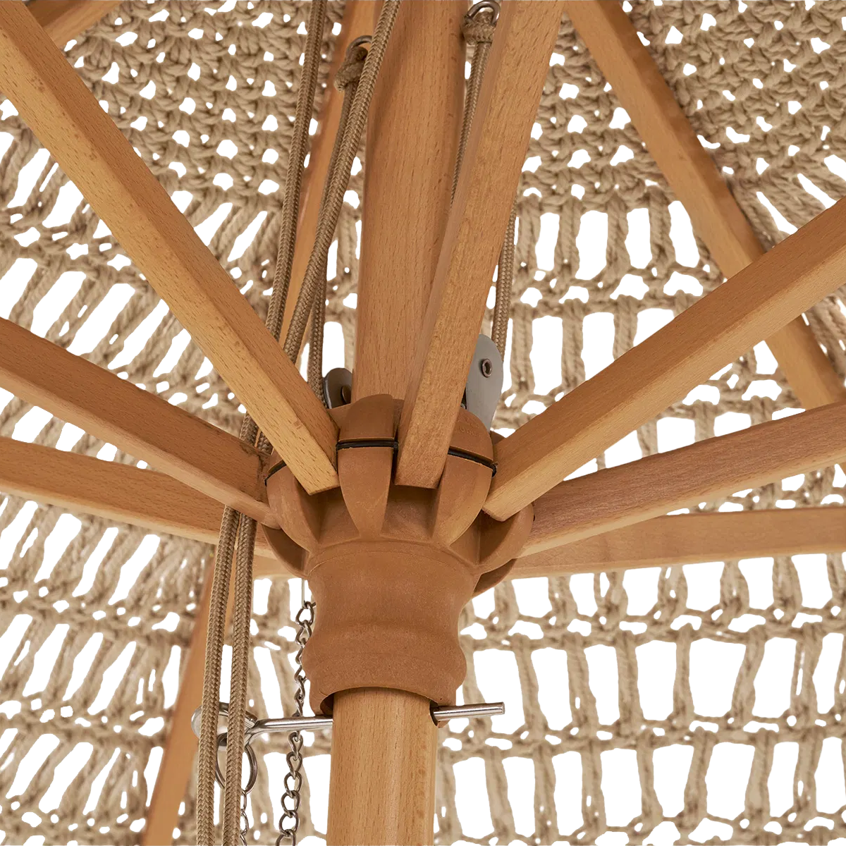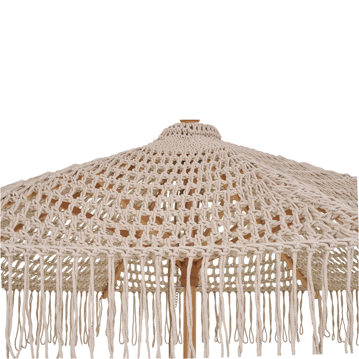 Op zoek naar een parasol die niet alleen verkoeling brengt, maar ook een echte eyecatcher is? Kijk dan eens naar de Malou gevlochten parasol van Artichok. Deze parasol in beige heeft een unieke, gevlochten katoenen kap met speelse franjes, waardoor hij een luxe en bohemian uitstraling krijgt. Perfect voor een zomerse sfeer in je tuin, op het terras of op het strand. Met een diameter van 250 cm en een hoogte van 255 cm biedt deze parasol een lichte schaduwplek. Doordat het katoenen doek geknoopt is, laat het zonlicht er deels doorheen, wat een prachtig speels lichteffect creëert. Ideaal voor wie van een beetje zon houdt, maar toch beschut wil zitten. Zet ‘m naast je loungeset, bij je eettafel of neem ‘m mee naar het strand voor een stijlvolle schaduwplek. Voordelen Uniek gevlochten parasol Gemaakt van stevig katoen wat luchtig en sfeervol is Double pulleystring systeem om eenvoudig open en dicht te doen Inclusief
