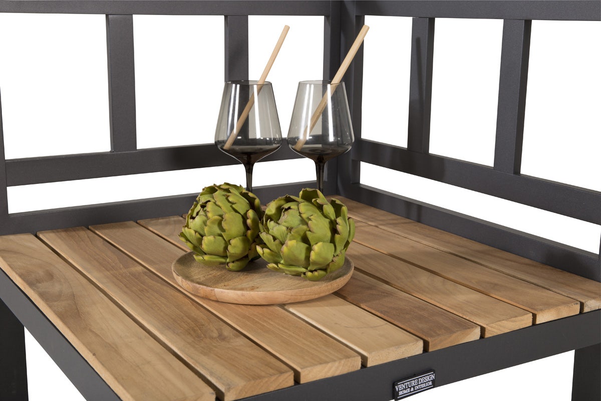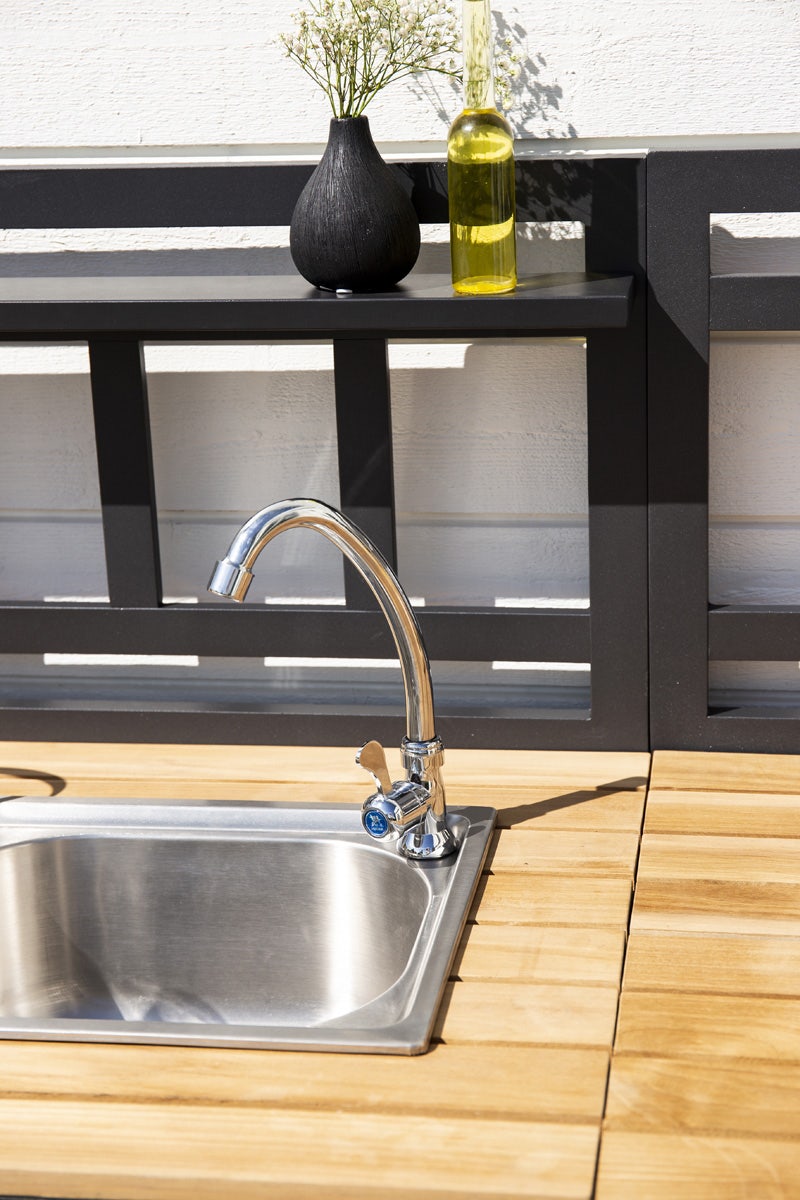 Stel je eigen buitenkeuken samen met het River hoekelement van Nest outdoor! Met de modulaire onderdelen van de River serie creëer je gemakkelijk een buitenkeuken die perfect in jouw tuin past. Met het zwarte aluminium frame en het teakhouten blad heeft River een stoere uitstraling. Dankzij de verbinding tussen de poten heb je extra veel plek om spullen neer te leggen of te bewaren. Geef de River buitenkeuken een mooi plekje in de tuin en geniet van een gezellig zomers diner! Voordelen Modulair buitenkeuken hoekelement Gemaakt van aluminium en teakhout Bestand tegen de weersomstandigheden Dankzij de losse elementen bepaal je zelf de indeling van jouw buitenkeuken
