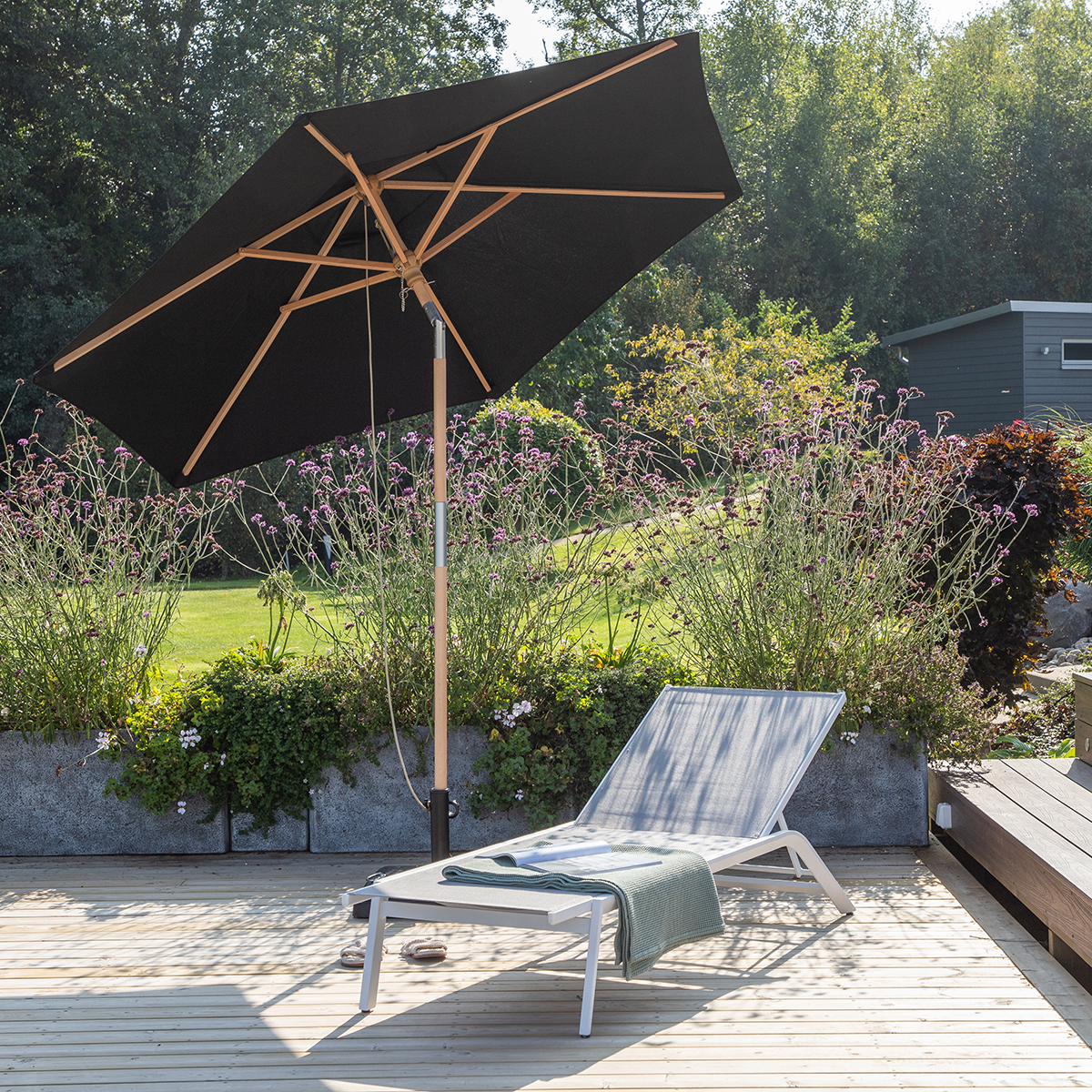 De Brandon zweefparasol van Nest outdoor geeft jouw buitenruimte direct een stijlvolle upgrade. Deze grote zweefparasol met een diameter van 3,5 meter is onmisbaar als je lekker wil genieten van de schaduw in de tuin. De parasol heeft een frame gemaakt van aluminium en een zwart polyester doek. De ronde paal heeft een diameter van 5,7 centimeter en is gemakkelijk te bevestigen in een parasolvoet. Let op: de zweefparasol wordt exclusief voet geleverd. Om de levensduur van de parasol te verlengen wordt aangeraden de parasol in te doen bij harde wind en regen, en tevens een parasolhoes te gebruiken. Deze volledig zwarte zweefparasol is de ultieme stijlvolle touch voor jouw tuin of terras. De zwengel zorgt ervoor dat de parasol gemakkelijk op te zetten is en de windvanger zorgt ervoor dat de wind kan circuleren en de warmte onder de parasol weg kan. Laat die zomerse dagen maar komen! Voordelen en tips Grote zweefparasol Exclusief
