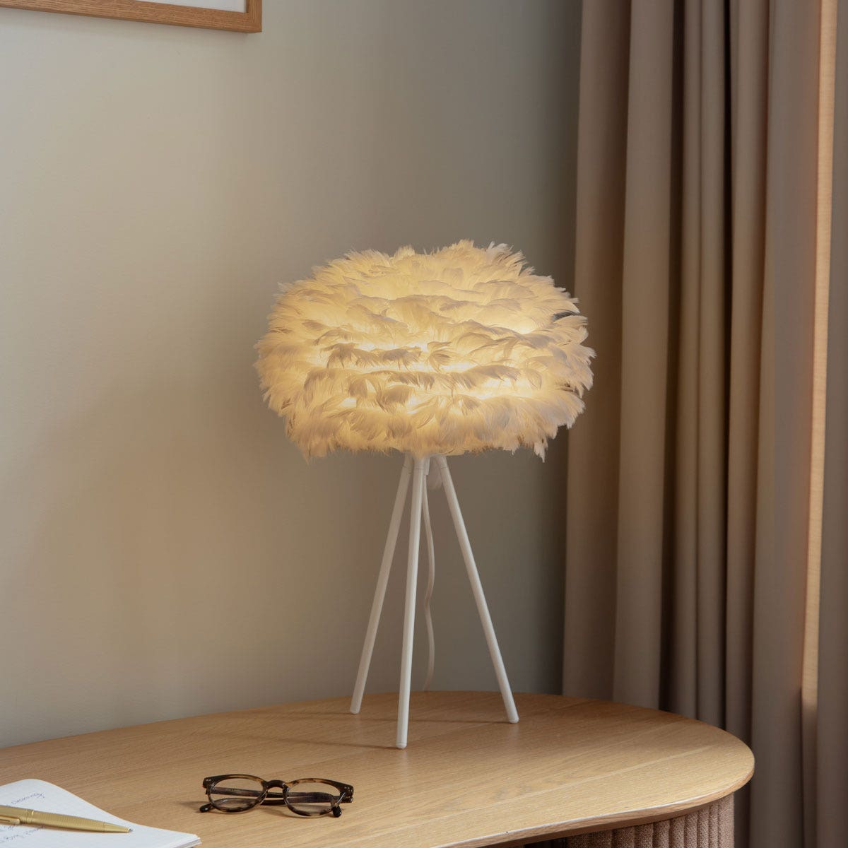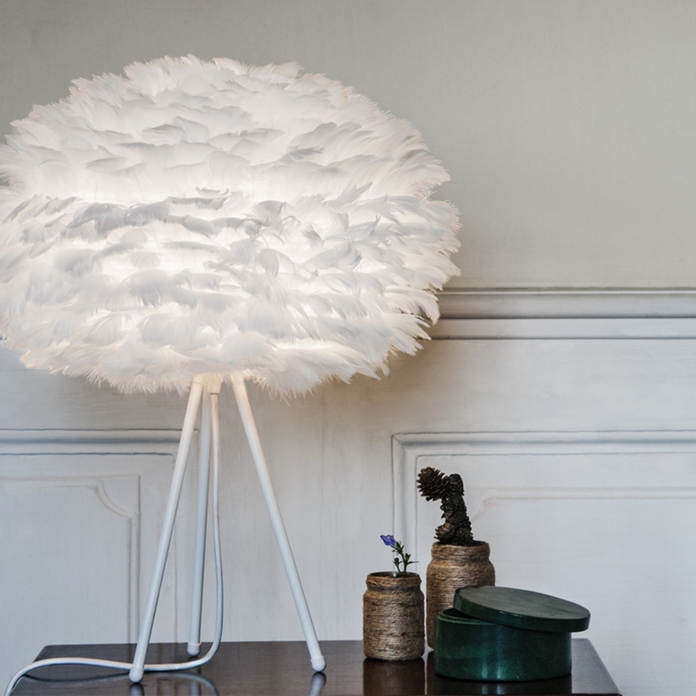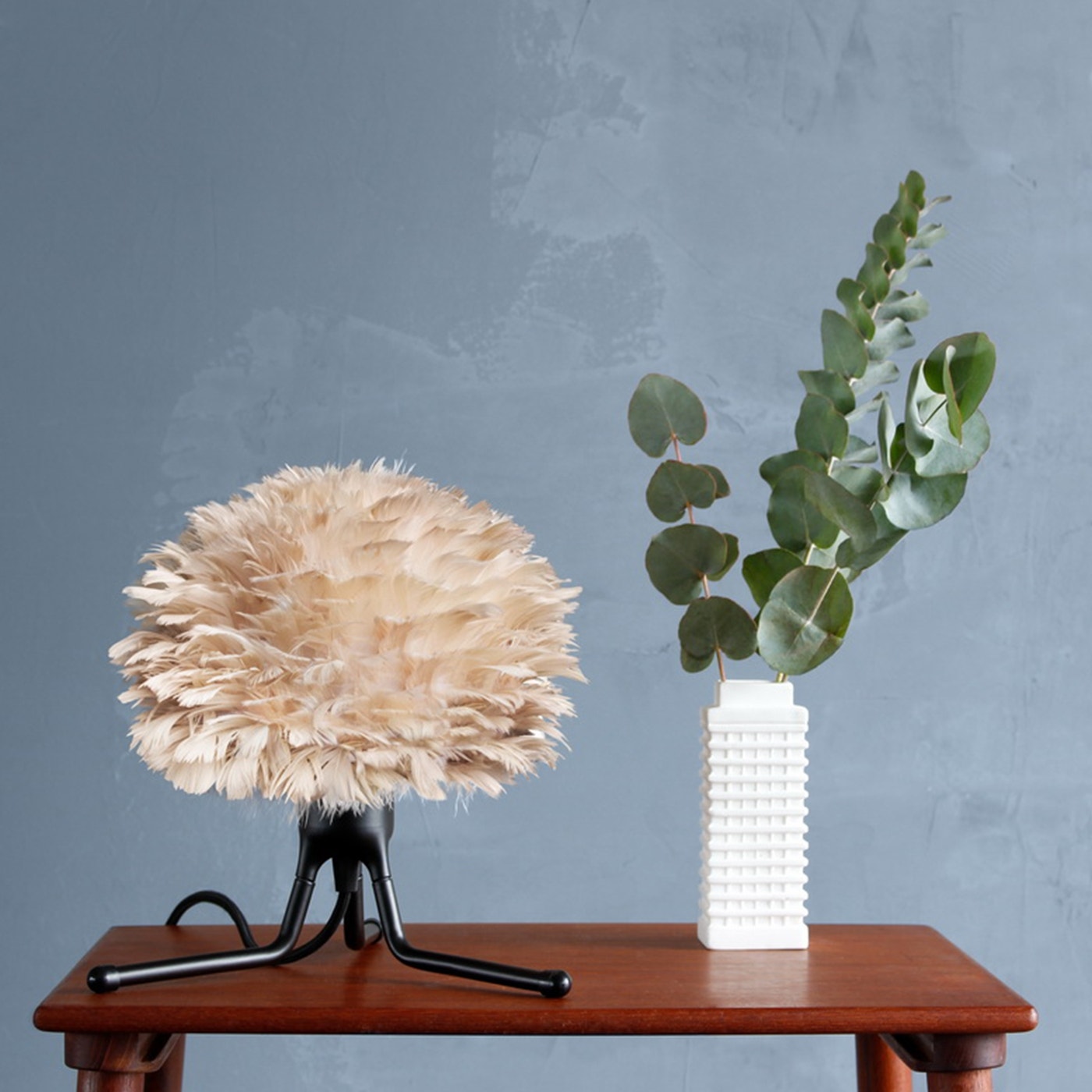De prachtige Umage Eos tafellamp Medium heeft een modern design en is gemaakt van echte ganzenveren. De Eos lampenkap is een perfecte sfeermaker voor in de woon- of slaapkamer. Zet de lamp in de slaapkamer, woonkamer of hal om direct sfeer te creëren. De tafellamp wordt geleverd in een mooie geschenkdoos van Umage. Bovendien onderhoud je de lampenkap goed door de lampenkap af en toe te föhnen, hierdoor blaas je gemakkelijk het stof van de veren en houd je ze luchtig! Het designproduct is ontstaan vanuit een milieubewuste gedachte. Geen van de gebruikte veren zijn afkomstig van slecht behandelde ganzen. Bij wet is Umage verplicht, evenals andere grote retailers ter wereld, om te documenteren waar de ganzen en veren vandaan komen. Je kunt dus genieten van een prachtig lichteffect in uw kamer, dat op milieuvriendelijke wijze tot stand is gebracht. Voor meer informatie bekijk hier de