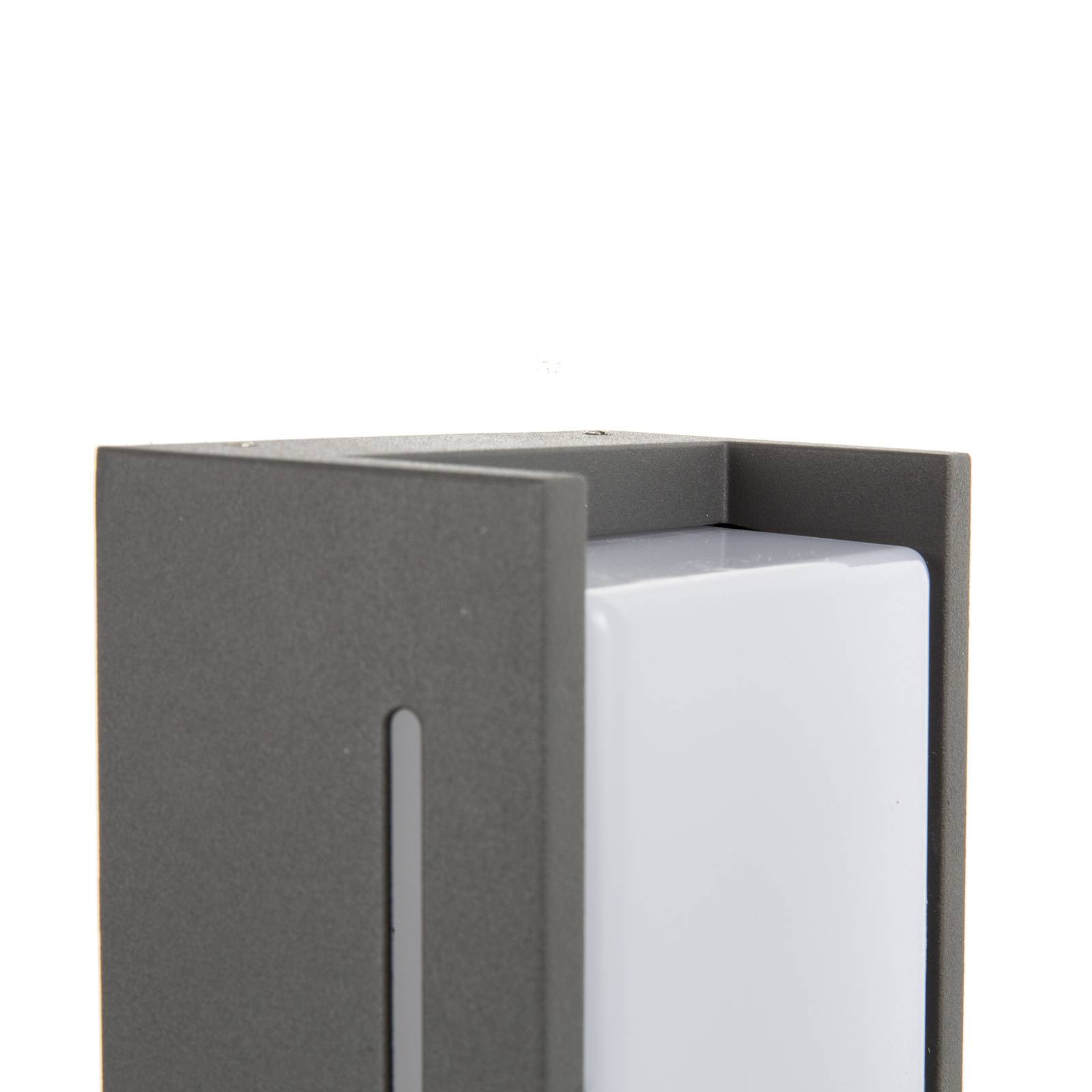 Antraciet buitenwandlamp Hoosic De Hoosic buitenmuurarmatuur kenmerkt zich door zijn eenvoudige, moderne uitstraling. Antracietkleurig metaal is gecombineerd met een cilindrische kunststofkap - het resultaat is een tijdloze en eenvoudige buitenmuurarmatuur die past bij elke gevel en bouwstijl. Het ziet er bijzonder aantrekkelijk uit wanneer meerdere armaturen uit de serie worden gecombineerd.