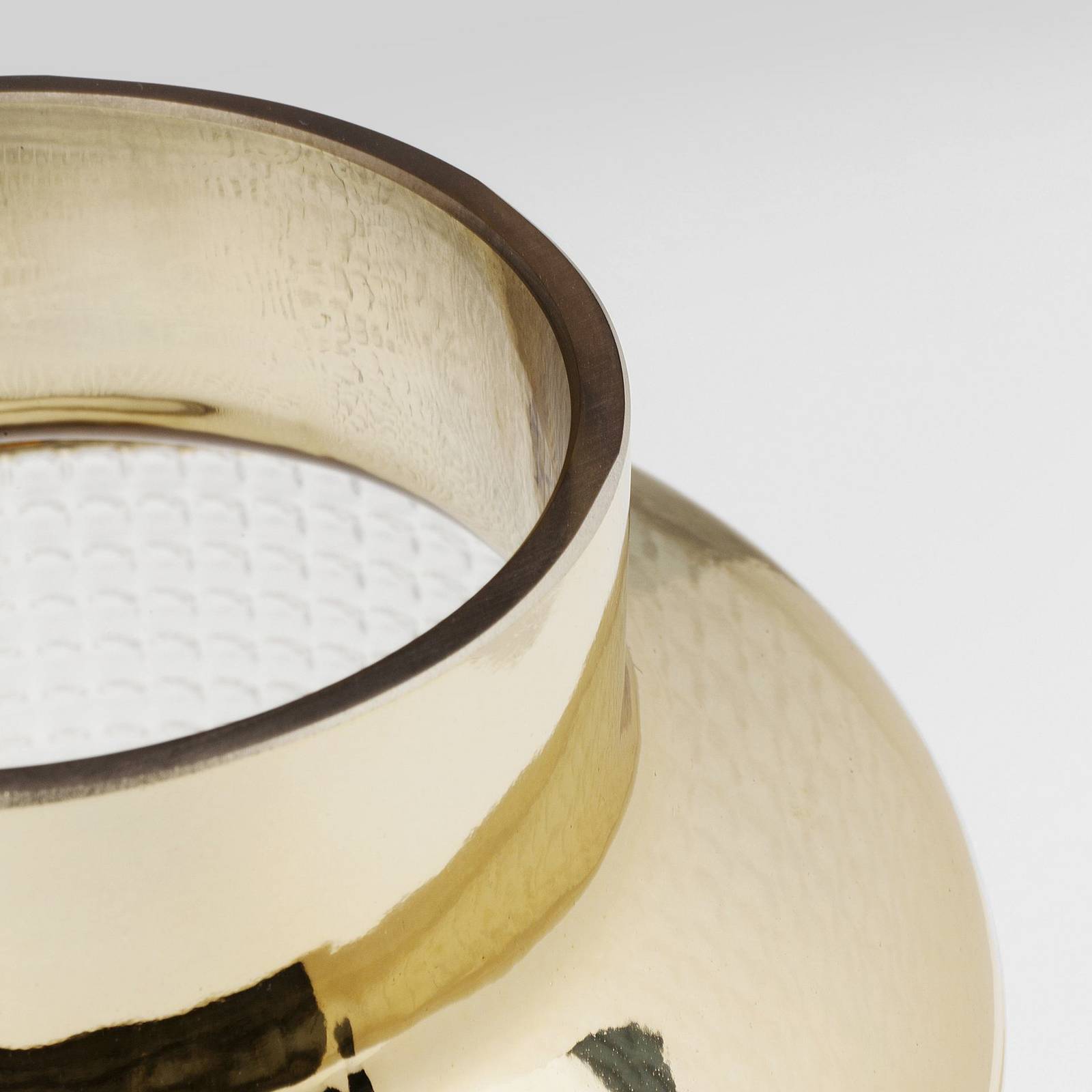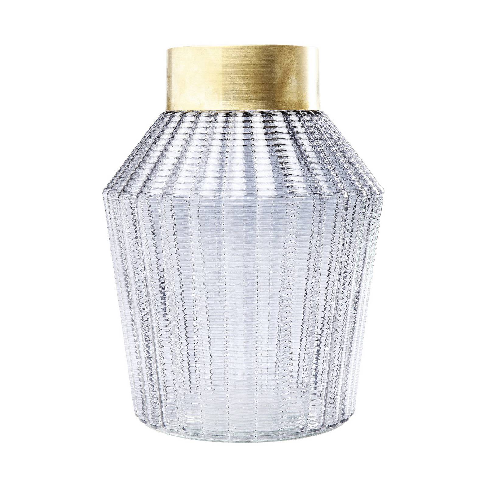 LA Noble vaas van gegroefd glas met gouden accenten - handgemaakt LA Noble is een kleine glazen bloemenvaas met een spannende designmix van gegroefde, transparante oppervlakken en gladde delen met een gouden kleur. Het accentueert weelderige bloemenpracht zoals pioenrozen, ranonkels en dahlia's nog mooier. Het strakke grafische reliëf van het glas krijgt een glamoureuze upgrade met de glanzende gouden accenten.
