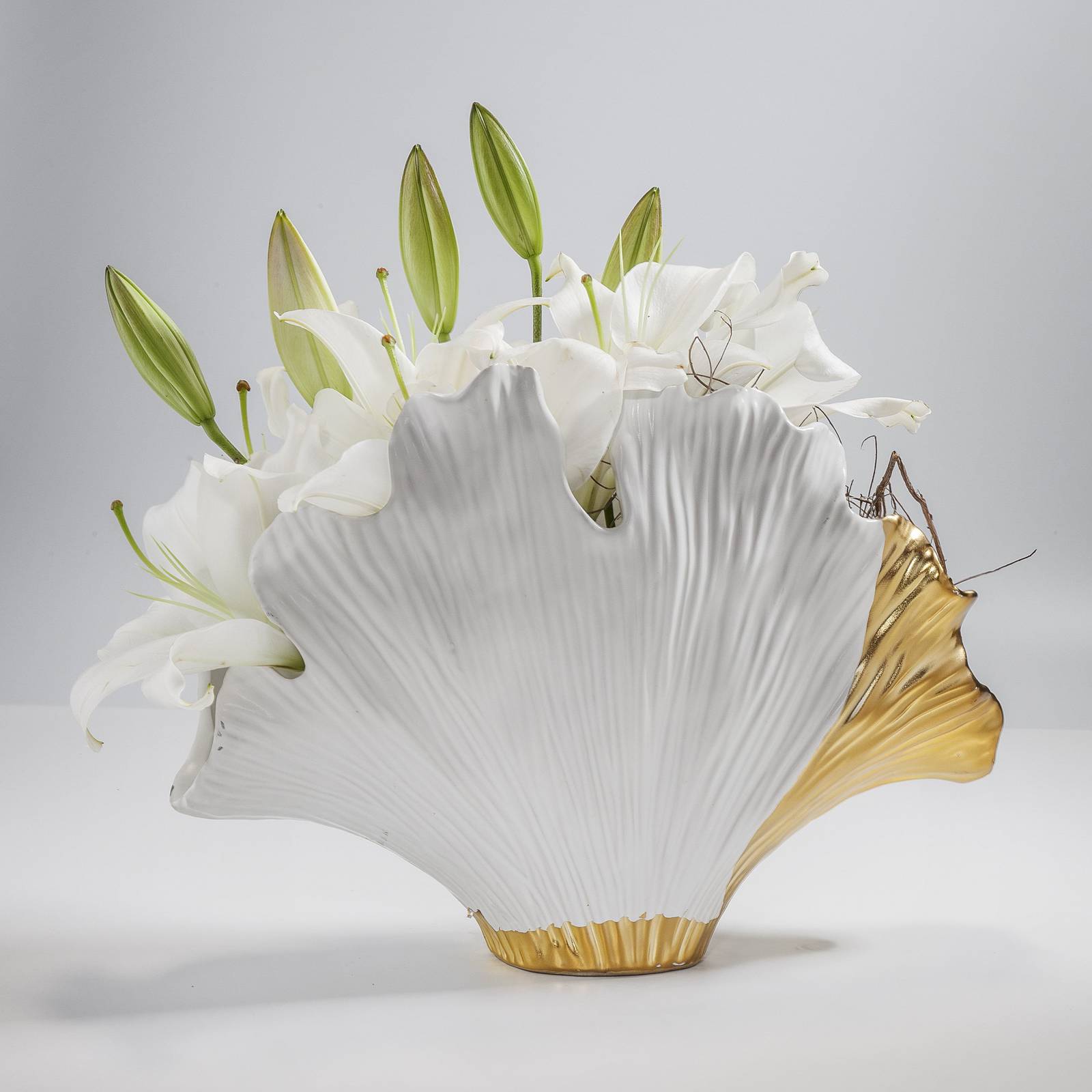 Ginkgo Elegance vaas van geglazuurd steengoed Deze artistieke vaas van keramiek in de unieke vorm van een ginkgoblad is een bijzondere blikvanger. Het witte keramiek van de geglazuurde vaas wordt versterkt door goudkleurige details, waardoor de vaas een elegante en luxe uitstraling krijgt en een verfijnde blikvanger is. De vaas is gemaakt van geglazuurd steengoed dat is gebakken bij een temperatuur van 1200 °C.