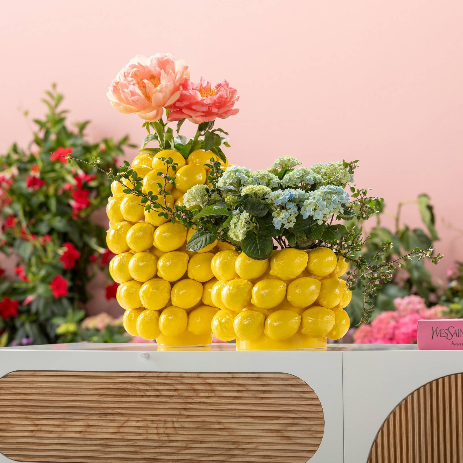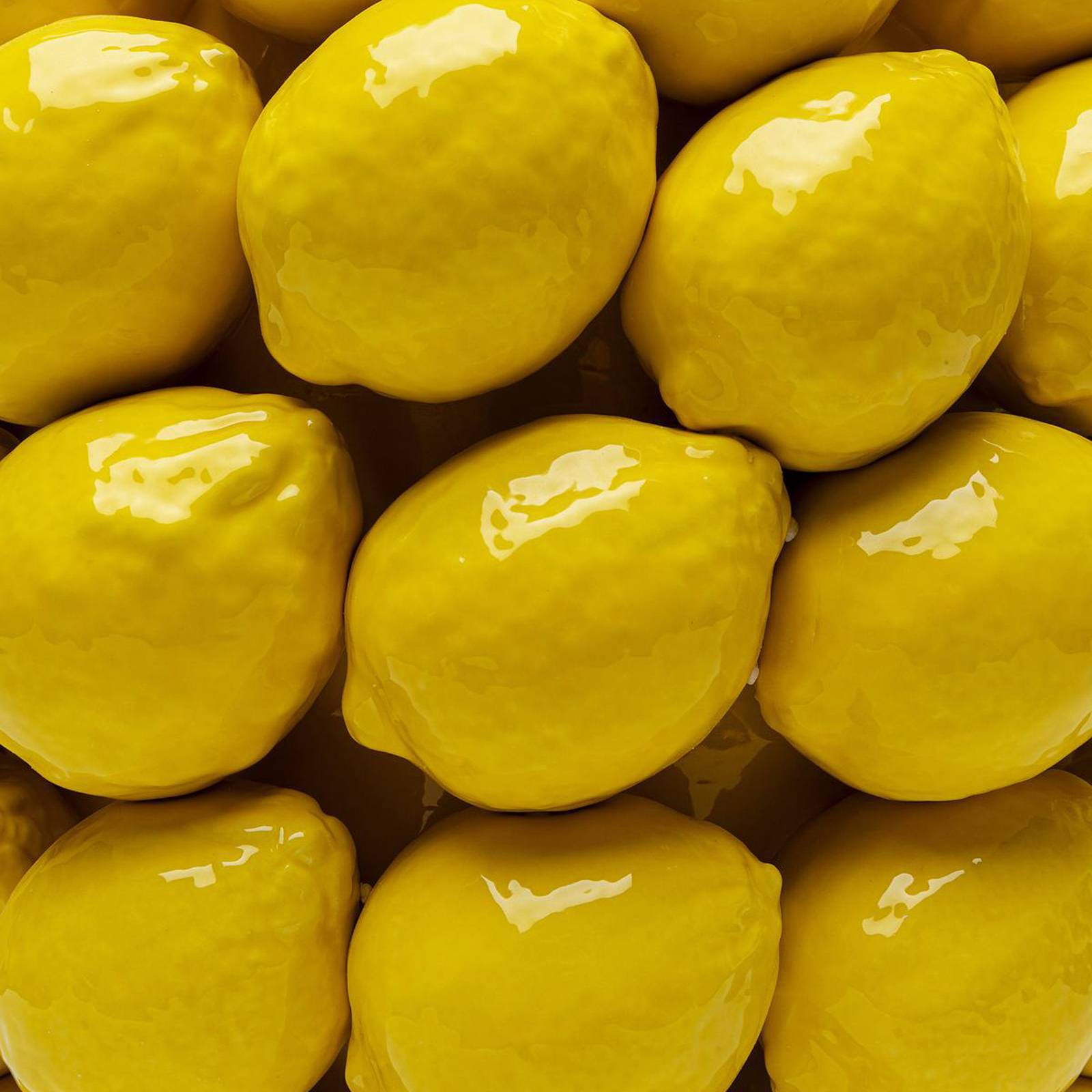 Citroensapvaas in bolvorm met citroenen Citroenvazen met imitatievruchten zijn populair omdat ze een vleugje kleur toevoegen aan elke kamer. De felgele kleur van de citroenen werkt verfrissend en opwekkend. Ze geven ook een natuurlijk en organisch tintje aan het interieurontwerp en kunnen worden gebruikt als decoratief element in zowel moderne als traditionele inrichtingsstijlen. De Lemon Juice vaas is handgemaakt van geglazuurd porselein - elk stuk is uniek.