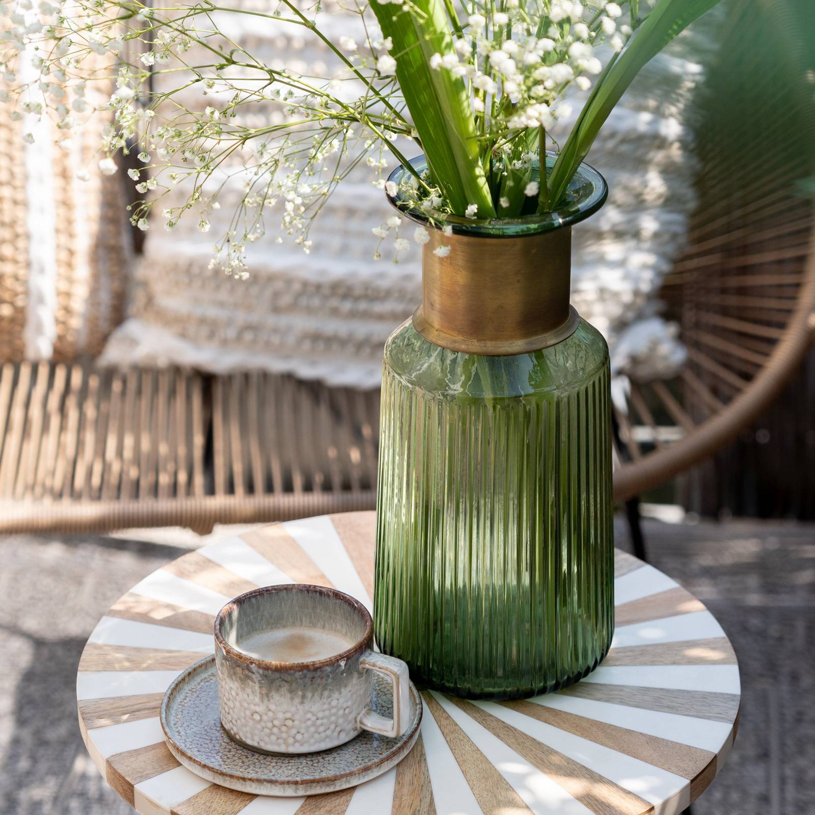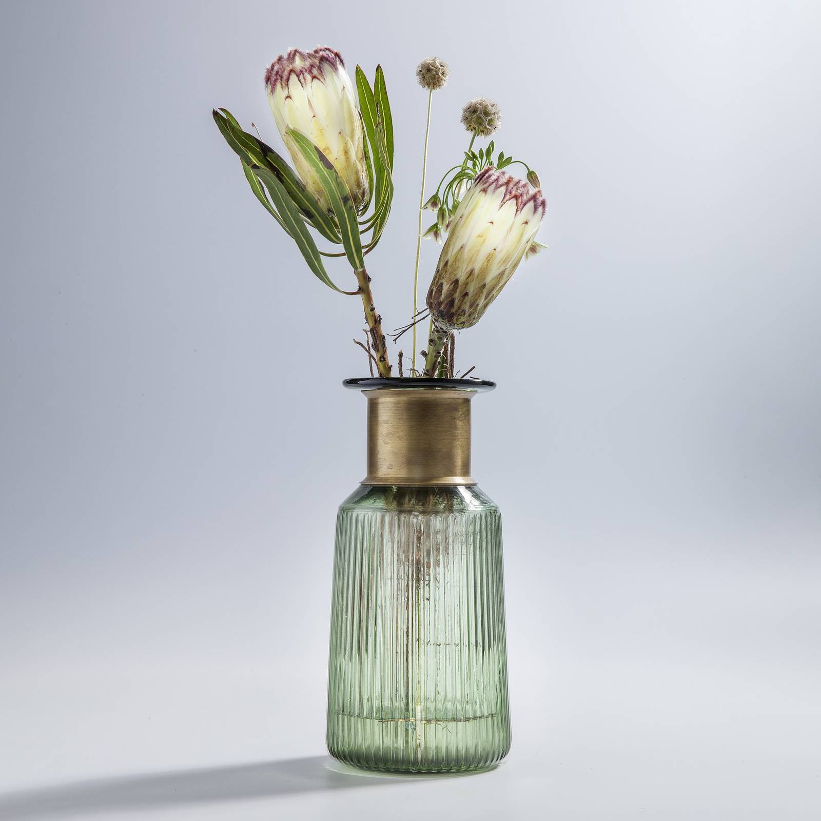 Barfly vaas van groen getint glas met messing-look decoratie De Barfly vaas in groen heeft iets GEWISSEN. De serie vazen speelt met zachte pastelkleuren, gevarieerde vormen en verschillend reliëf, massief glas. Het groen getinte glas en de prachtige vorm doen denken aan Murano-glaskunst. Een glinsterende messing band siert ook de hals van de vaas. De vaas kan romantisch gedecoreerd worden, past in de retrostijl en vormt een mooi contrast op een modern dressoir.