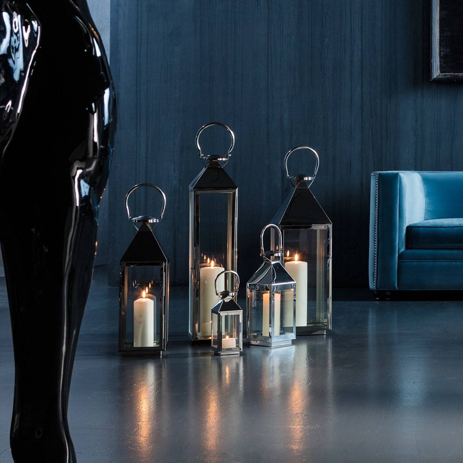 Lantaarn Giardino van roestvrij staal en glas in een set van vier Deze lantaarns Giardino van gepolijst roestvrij staal en glas in een set van vier verschillende maten verspreiden een sprankelend licht en een warme sfeer in de hal of in woonruimtes. De opgegeven afmetingen hebben betrekking op de grootste lantaarn.