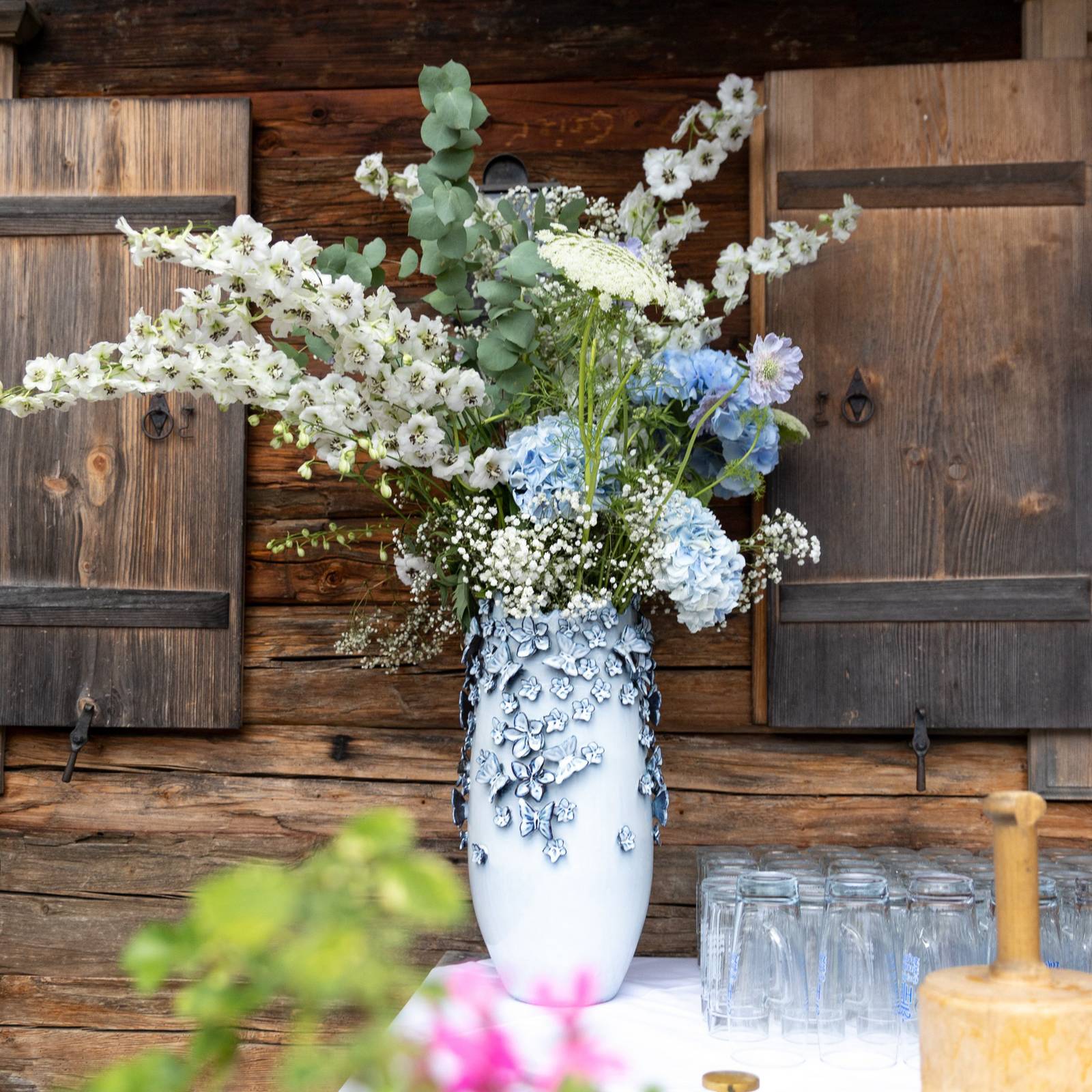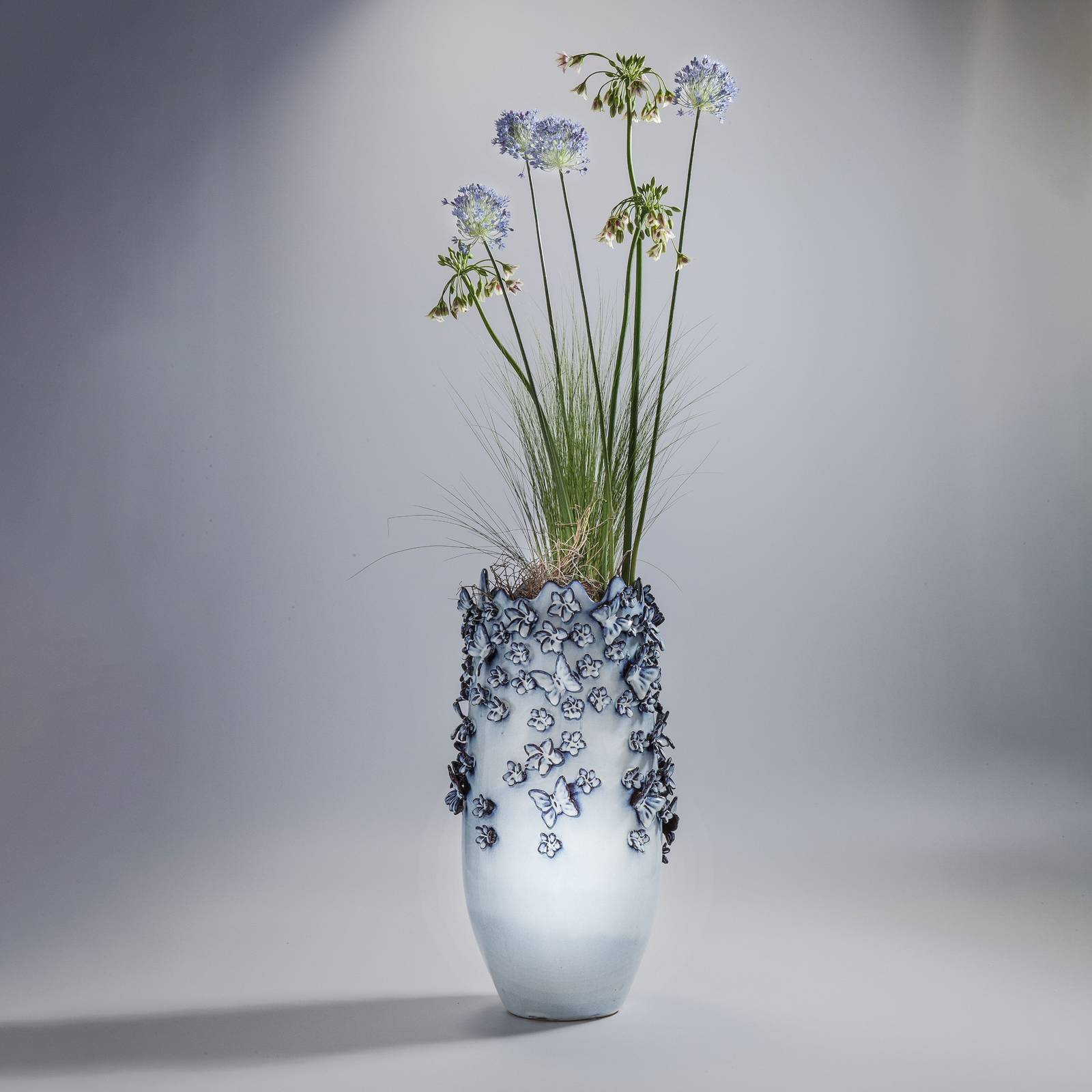 Vaas met vlinders in lichtblauw gemaakt van steengoed Deze prachtige decoratieve vaas met vlinders in fris lichtblauw en met vlinders als mooie decoraties combineert artistieke, romantische charme met een modern tintje. De hoge vaas is perfect voor eigentijdse interieurs en is een blikvanger waar hij ook staat.